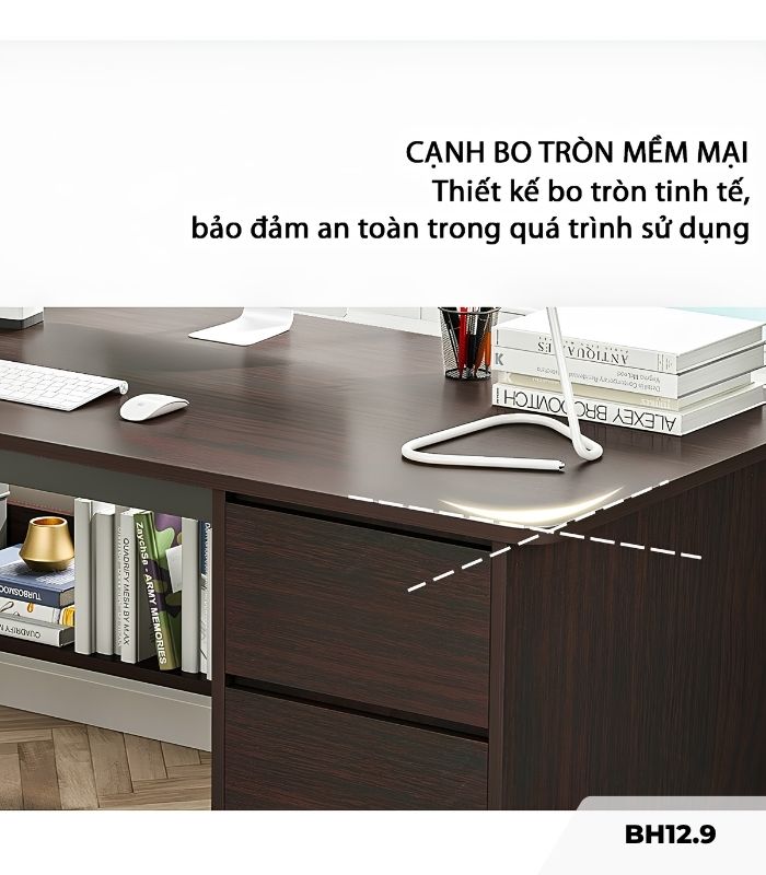 Nhờ thiết kế thông minh, phần tủ và kệ lưu trữ dưới được tích hợp hài hòa, cung cấp giải pháp cất giữ đồ đạc kín đáo, sạch sẽ và chống bụi bẩn. Sự ổn định của cấu trúc giúp chiếc bàn luôn bền bỉ, đáp ứng hoàn hảo các tác vụ viết lách hay đọc sách.