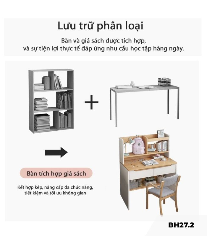 Sản phẩm tích hợp liền mạch giữa bàn làm việc và hệ thống giá sách tiện dụng. Khu vực lưu trữ được phân chia khoa học với các ngăn kệ trên có thanh chắn chống rơi và ngăn kéo phân loại kín đáo bên dưới. Bạn có thể sắp xếp đồ dùng từ sách vở, hồ sơ đến balo một cách trật tự, giúp góc làm việc luôn sạch sẽ và ngăn nắp.