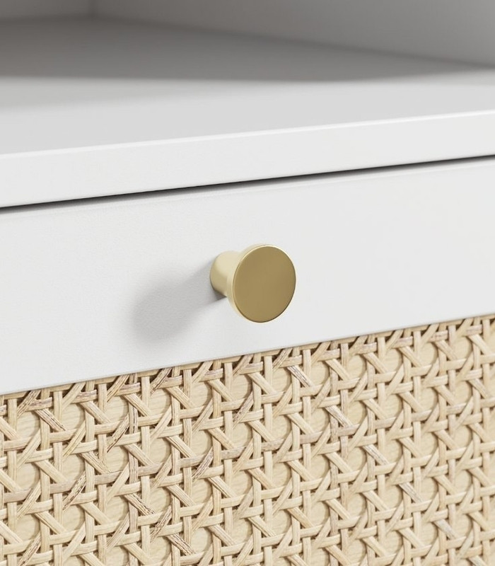 Điểm nhấn nổi bật của mẫu bàn nằm ở phần cánh ngăn kéo phủ mây sơn một mặt, tạo cảm giác tự nhiên và ấm áp giữa tổng thể trắng tinh tế. Thiết kế này vừa mang nét hiện đại, vừa gợi chút mộc mạc, giúp không gian làm việc trở nên gần gũi và dễ chịu hơn.