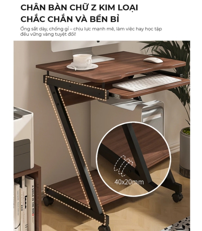 Sản phẩm có kích thước 60cm x 50cm x 76cm. Bàn làm việc gọn nhẹ, có bánh xe di động thông minh, khung sắt hộp chắc chắn giúp bạn thoải mái đặt máy tính, tài liệu và các vật dụng cần thiết khác.