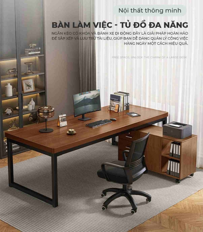 Bàn được tích hợp tủ hồ sơ đa năng với nhiều ngăn chứa, giúp bạn sắp xếp tài liệu và đồ dùng cá nhân một cách gọn gàng. Thiết kế tủ linh hoạt giúp dễ dàng di chuyển và thay đổi vị trí tùy theo nhu cầu, mang lại sự tiện lợi trong quá trình sử dụng hàng ngày.