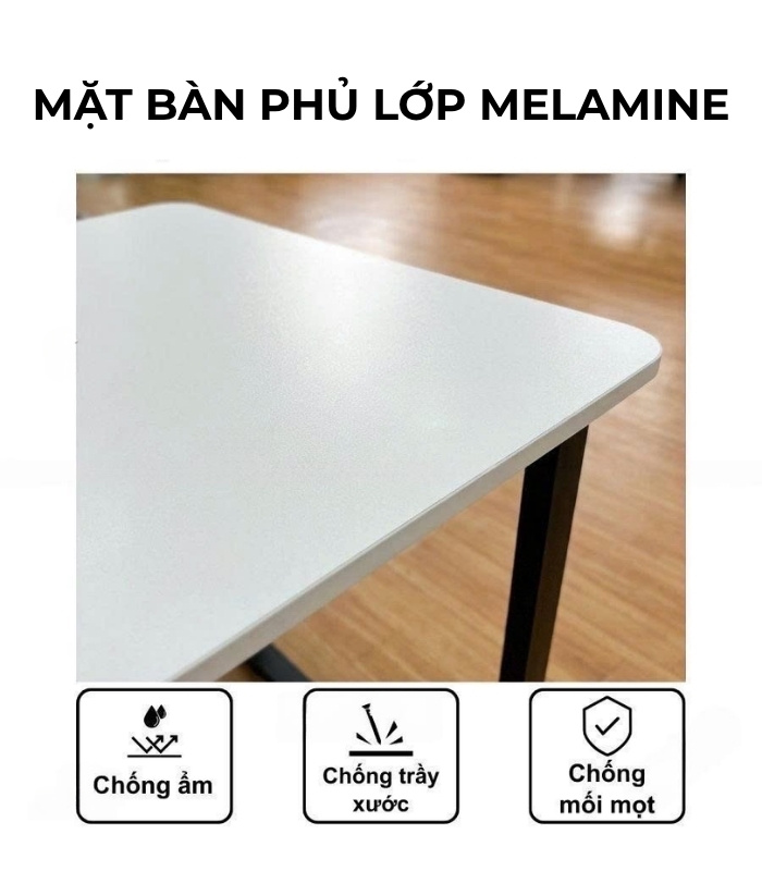 Thiết kế chân chữ U mang lại sự chắc chắn và ổn định trong quá trình sử dụng. Mặt bàn được bo tròn các góc giúp tăng độ an toàn, đặc biệt phù hợp với gia đình có trẻ nhỏ. Bề mặt MDF phủ Melamine giúp chống trầy xước, chống ẩm và dễ vệ sinh.
