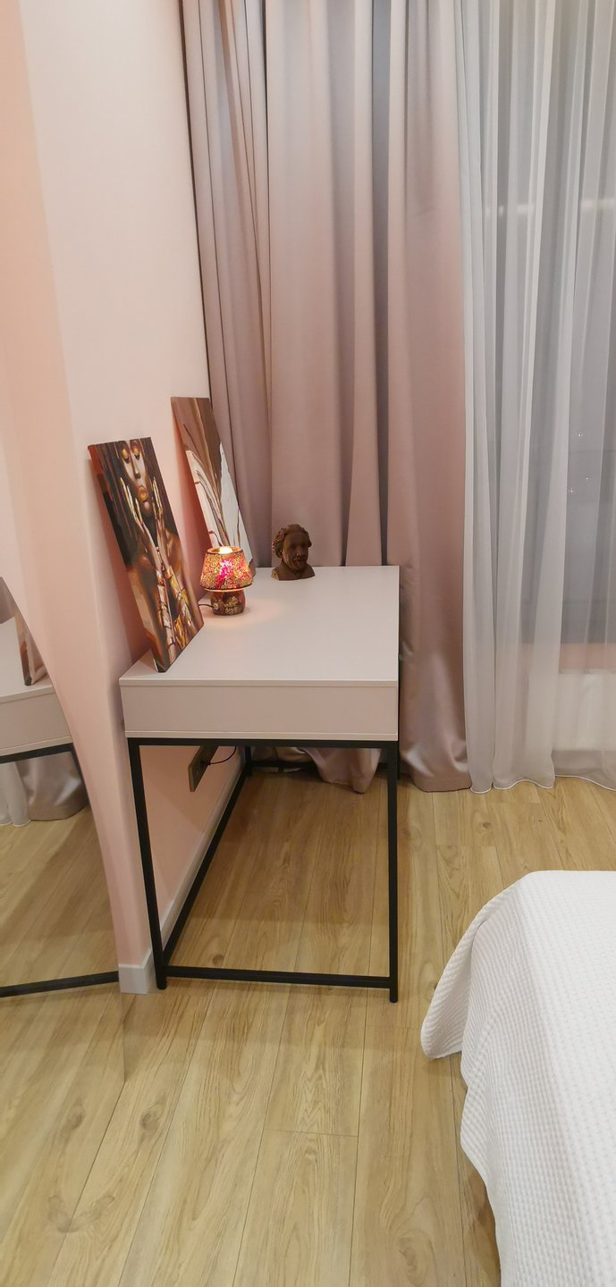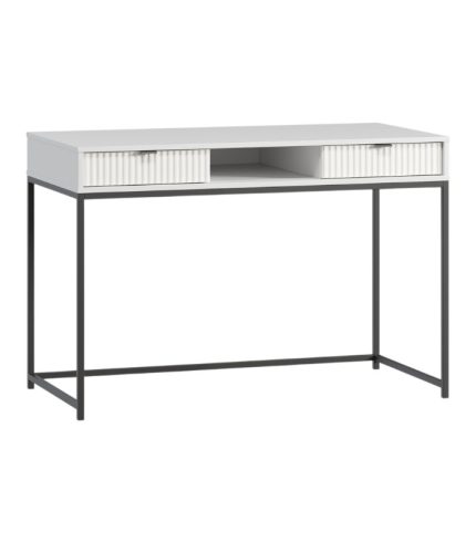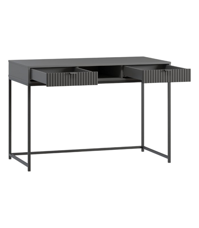 Sự kết hợp giữa tông xám chì trầm tĩnh và cánh lam đồng màu mang đến điểm nhấn hiện đại, nhẹ nhàng nhưng không kém phần sang trọng. Thiết kế 2 ngăn kéo hai bên cùng ngăn mở chính giữa tối ưu hóa không gian lưu trữ, giữ cho mặt bàn luôn gọn gàng, tinh tế trong từng chi tiết.