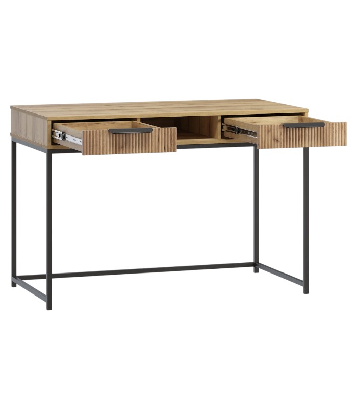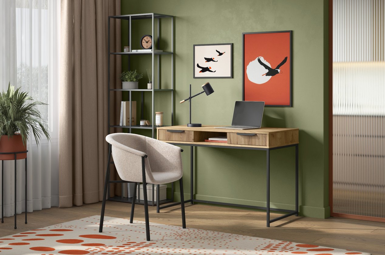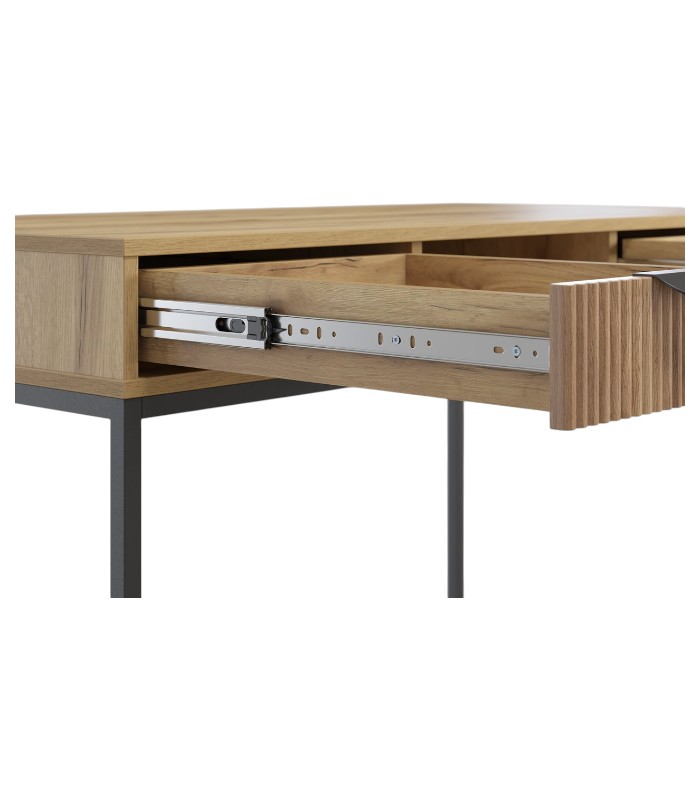 Bàn có 2 hộc kéo tiện dụng, đủ để sắp xếp tài liệu, phụ kiện và các vật dụng cần thiết, giữ mặt bàn luôn thoáng đãng. Với chiều cao 82 cm và mặt bàn rộng rãi, bạn có thể bố trí laptop, sách vở, đèn bàn hoặc những món trang trí nhỏ, tạo không gian làm việc vừa khoa học vừa sinh động.