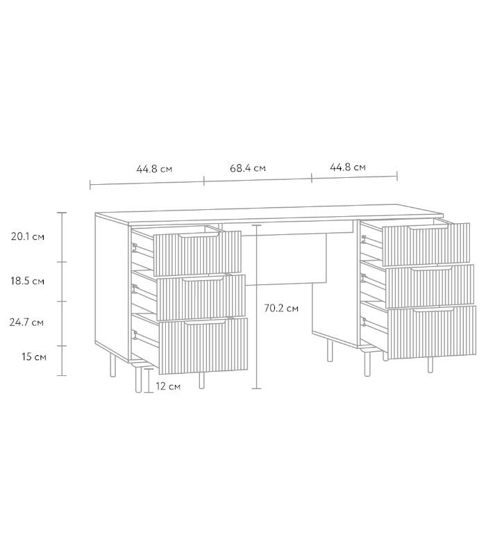 Thiết kế gồm 6 ngăn kéo được bố trí đối xứng hai bên, mang lại không gian lưu trữ rộng rãi và tiện lợi. Người dùng có thể dễ dàng sắp xếp tài liệu, phụ kiện hay vật dụng cá nhân gọn gàng, đồng thời giữ mặt bàn luôn thoáng và ngăn nắp. Phần chân sắt sơn tĩnh điện màu đen giúp tổng thể trở nên thanh thoát, vững chắc và hiện đại hơn.