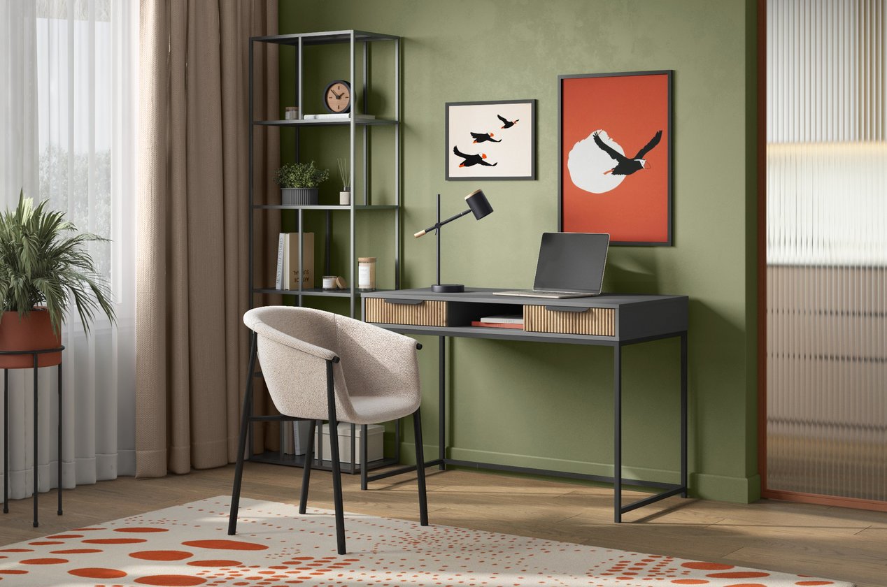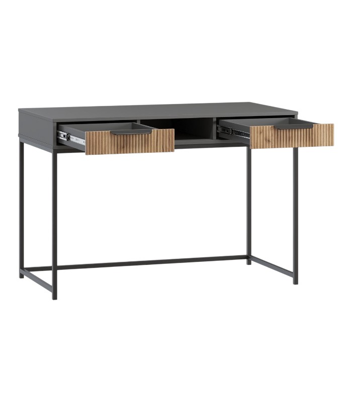 Bàn có 2 hộc kéo tiện dụng, giúp sắp xếp tài liệu, phụ kiện và vật dụng cần thiết, giữ mặt bàn luôn gọn gàng. Chiều cao 82 cm và mặt bàn rộng rãi đủ không gian bố trí laptop, sách vở, đèn bàn hay vật trang trí nhỏ, tạo góc làm việc vừa khoa học vừa sinh động.