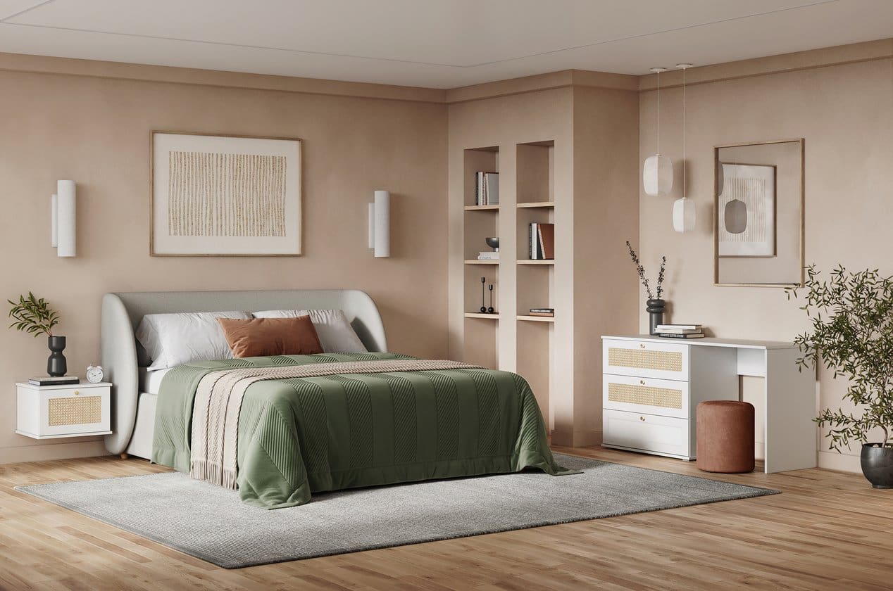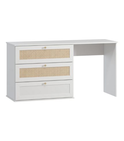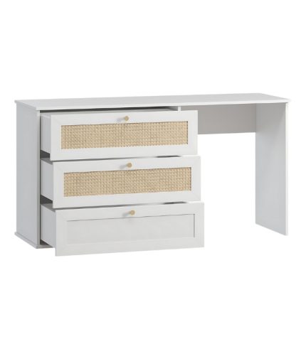 Cánh ngăn kéo được phủ mây sơn một mặt – đặc trưng của bộ sưu tập Alvis – mang lại cảm giác tự nhiên, thoáng nhẹ và mềm mại trong tổng thể trắng tinh khiết. Bàn có thể kết hợp cùng ghế đôn hoặc gương treo tường, tạo nên góc làm đẹp riêng tư và thanh lịch trong phòng ngủ.