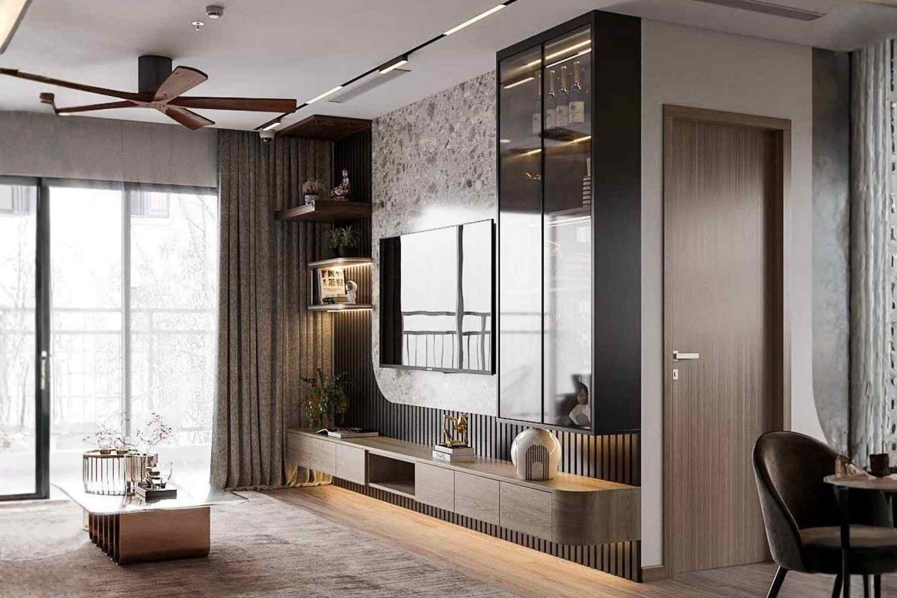Bao quanh là hệ ốp nan bản nhỏ kết hợp các đợt trang trí, được thi công tỉ mỉ, liền mạch và sắc nét. Các đường nan chạy dọc tạo hiệu ứng kéo cao không gian, giúp phòng khách trở nên thanh thoát và rộng mở hơn. Những đợt kệ mở được tích hợp khéo léo là nơi lý tưởng để trưng bày sách, vật phẩm decor hoặc cây xanh nhỏ, góp phần tạo nên nét sinh động và cá tính riêng. Bên cạnh đó, tủ trang trí cánh khung nhôm cao cấp là chi tiết nâng tầm đẳng cấp cho toàn bộ thiết kế. Sự kết hợp giữa phần cánh kính và hệ đèn LED âm mang đến hiệu ứng trưng bày sang trọng, giúp tôn lên vẻ đẹp của các chai rượu, đồ lưu niệm hay vật phẩm trang trí bên trong. Đây không chỉ là khu vực lưu trữ tiện ích mà còn thể hiện gu thẩm mỹ tinh tế của gia chủ.