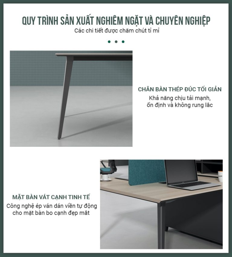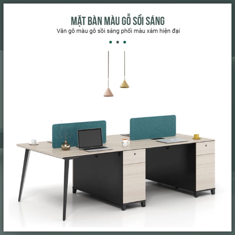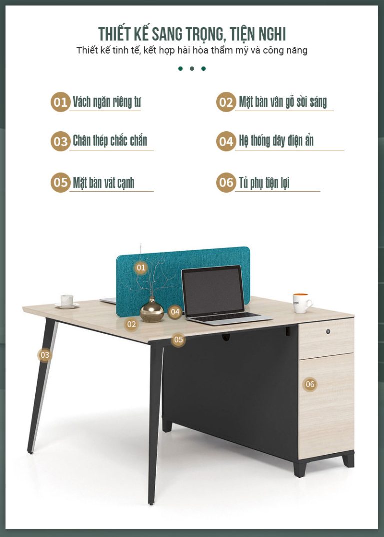Điểm nhấn của sản phẩm là hệ vách ngăn lửng giữa bàn, giúp tạo khoảng riêng tư vừa đủ cho từng nhân viên. Thiết kế này giúp hạn chế sự phân tâm trong quá trình làm việc, đồng thời vẫn duy trì được tính tương tác – yếu tố quan trọng trong môi trường teamwork hiện đại. Mặt bàn sử dụng chất liệu gỗ MDF phủ Melamine cao cấp, có độ bền cao, chống cong vênh và chống trầy xước hiệu quả. Bề mặt nhẵn mịn giúp dễ lau chùi và giữ được vẻ thẩm mỹ lâu dài trong quá trình sử dụng.
