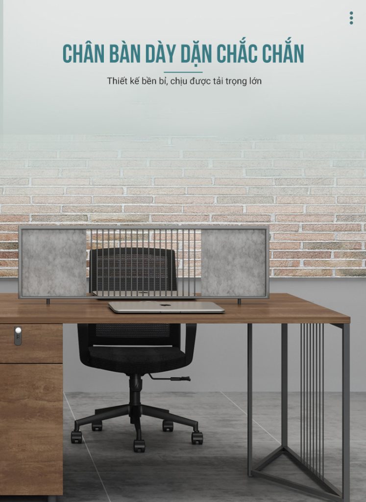 Thiết kế module 2 chỗ ngồi giúp tận dụng diện tích hiệu quả hơn so với việc sử dụng hai bàn làm việc riêng lẻ. Cách bố trí đối xứng tạo nên sự cân bằng trong tổng thể, đồng thời hỗ trợ hai nhân viên dễ dàng trao đổi công việc mà vẫn giữ được sự riêng tư cần thiết. Đây là lựa chọn rất phù hợp cho các bộ phận làm việc theo nhóm nhỏ hoặc các phòng ban cần sự phối hợp thường xuyên.Điểm nhấn nổi bật của sản phẩm nằm ở hệ vách ngăn lửng bằng khung sắt sơn tĩnh điện phối gỗ, thiết kế dạng lưới thoáng hiện đại. Phần vách ngăn giúp phân chia không gian làm việc rõ ràng hơn, hạn chế sự xao nhãng trong quá trình làm việc nhưng không tạo cảm giác tách biệt hoàn toàn. Nhờ đó, môi trường làm việc vẫn giữ được tính mở và sự kết nối cần thiết.