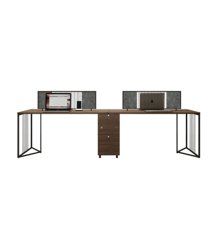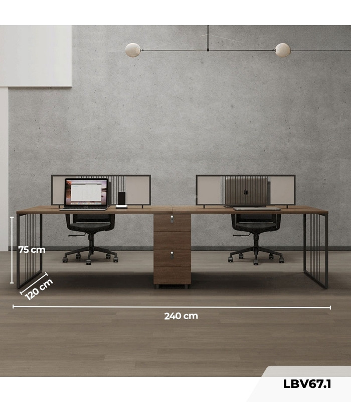 LBV67.1 là mẫu cụm bàn làm việc 4 người mang phong cách hiện đại, sang trọng và đầy tính chuyên nghiệp, phù hợp với các văn phòng doanh nghiệp chú trọng cả công năng lẫn thẩm mỹ không gian. Thiết kế mạnh mẽ với tone màu vân gỗ đậm kết hợp khung thép hiện đại giúp sản phẩm tạo nên điểm nhấn nổi bật, đồng thời mang lại môi trường làm việc khoa học và hiệu quả cho nhân viên.