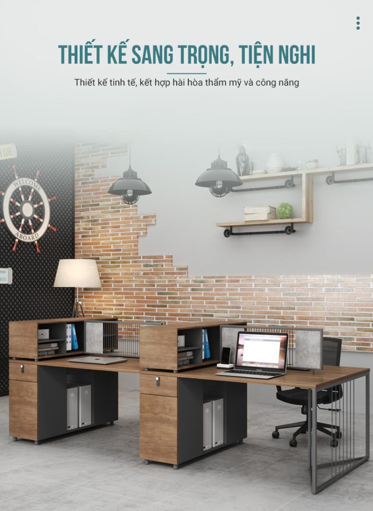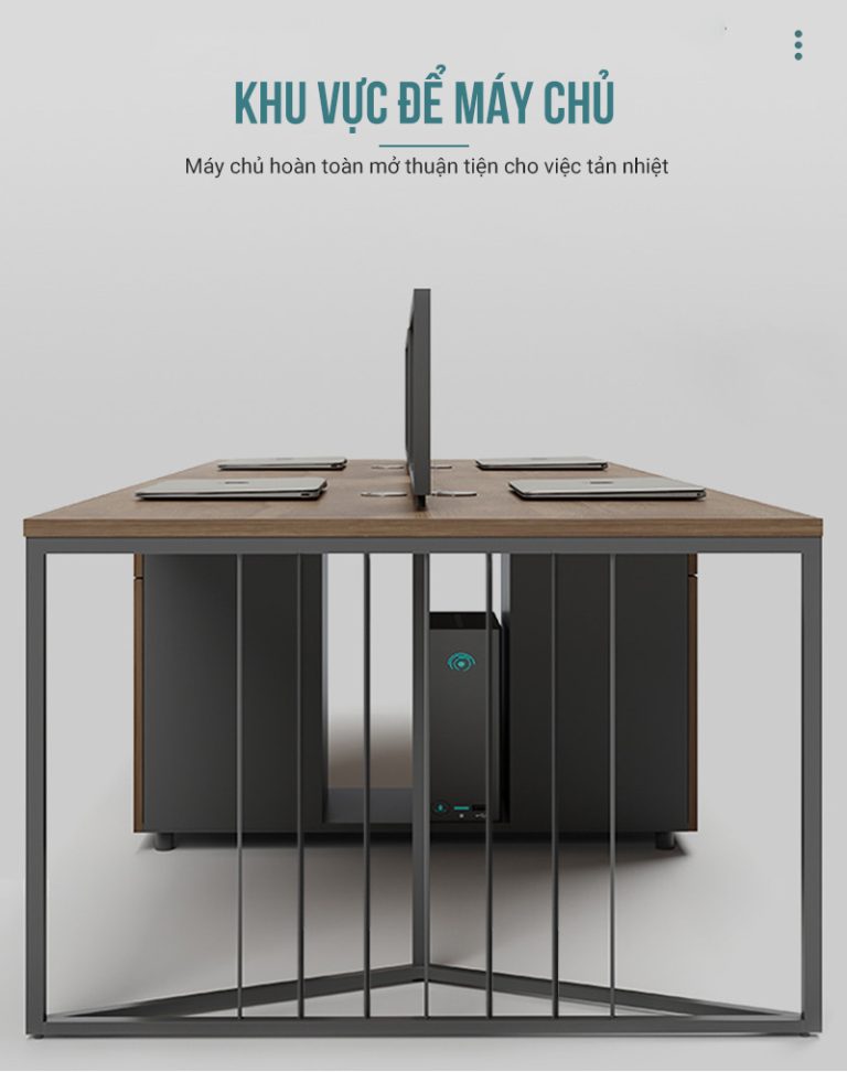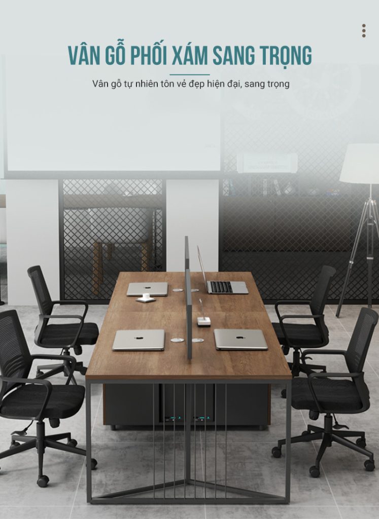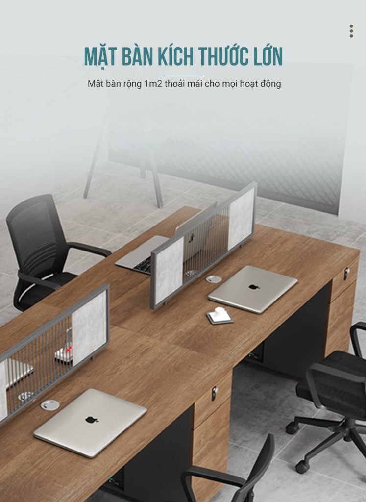 Điểm nổi bật của sản phẩm nằm ở phần vách ngăn sắt sơn tĩnh điện phối gỗ trên mặt bàn. Thiết kế lưới thoáng hiện đại vừa giúp phân chia không gian làm việc rõ ràng cho từng cá nhân, vừa giữ được sự thông thoáng cần thiết, tránh cảm giác bí bách thường thấy ở các mẫu vách kín truyền thống. Điều này giúp nhân viên có sự riêng tư vừa đủ nhưng vẫn dễ dàng tương tác khi cần thiết.