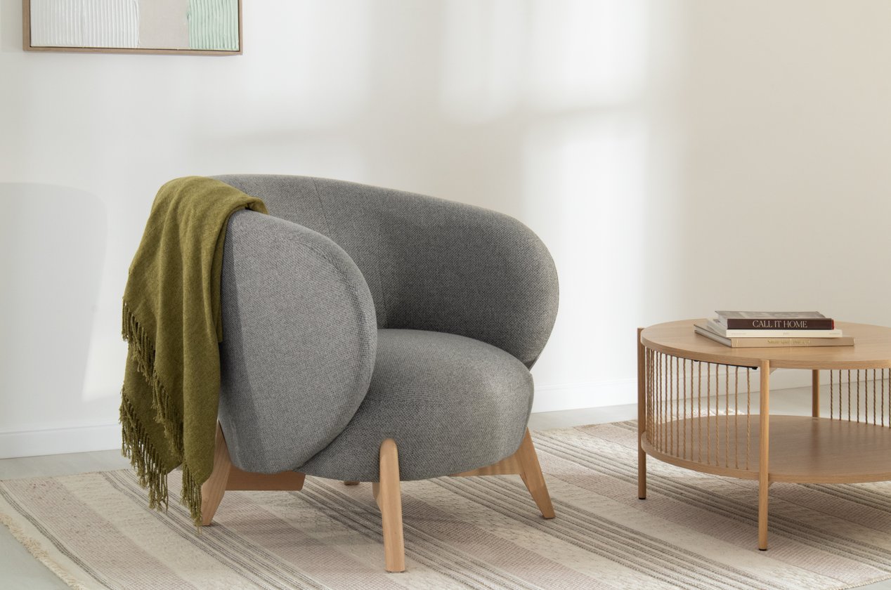 Chân gỗ sáng kết hợp với màu xám nhạt tạo nên tổng thể hài hòa, dễ kết hợp vật dụng trang trí như gối ôm pastel hoặc bàn trà gỗ. Kết cấu ghế chắc chắn cho trải nghiệm ngồi ổn định.