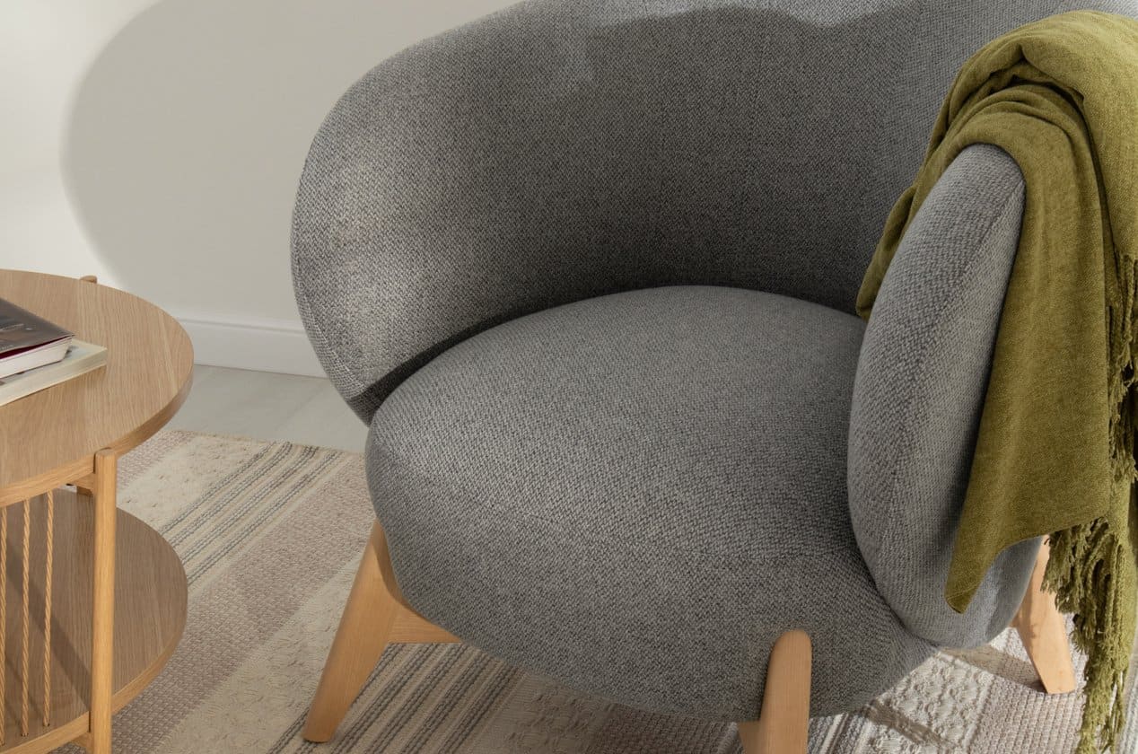 Chân gỗ sáng kết hợp với màu xám nhạt tạo nên tổng thể hài hòa, dễ kết hợp vật dụng trang trí như gối ôm pastel hoặc bàn trà gỗ. Kết cấu ghế chắc chắn cho trải nghiệm ngồi ổn định.