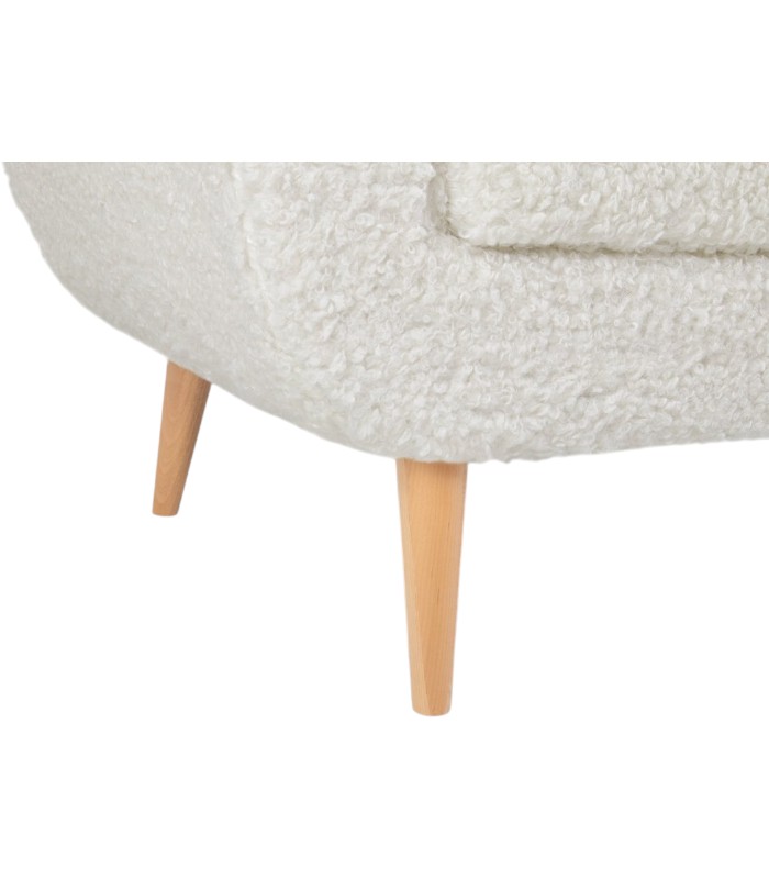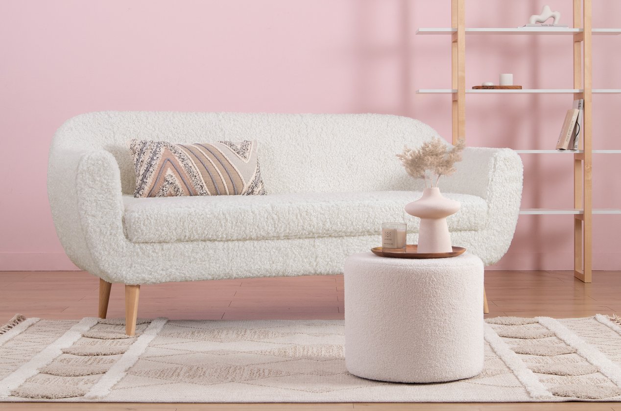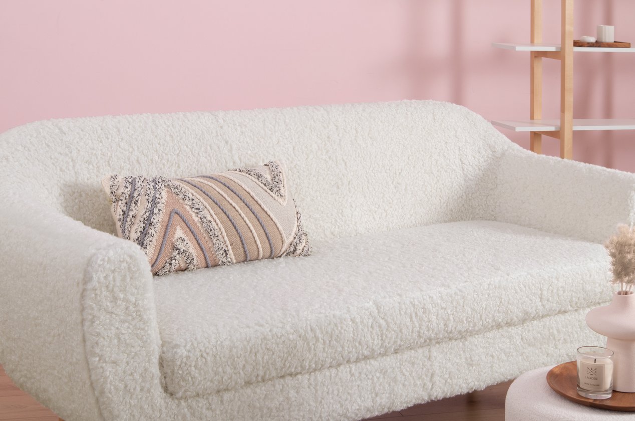 Bề mặt sofa được bọc vải lông cừu Dobby với kết cấu mềm xốp, tạo cảm giác êm ái và dễ chịu khi ngồi hay tựa lưng. Chất vải mang đến vẻ đẹp gần gũi, thân thiện, gợi cảm giác ấm áp như một góc nghỉ ngơi nhỏ trong căn nhà. Thiết kế form ghế bo tròn nhẹ nhàng giúp tổng thể trở nên mềm mại và hài hòa hơn, đồng thời tăng cảm giác thư giãn khi sử dụng.