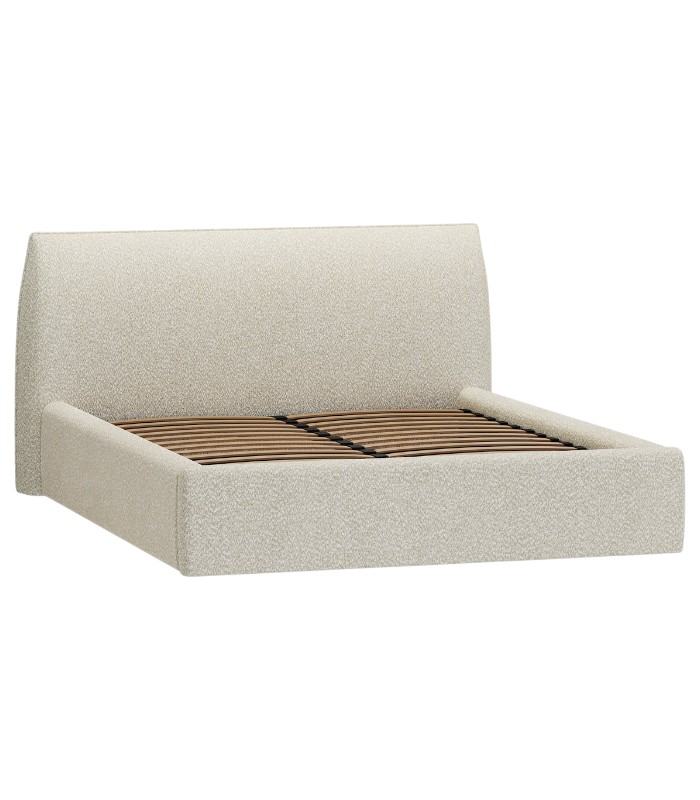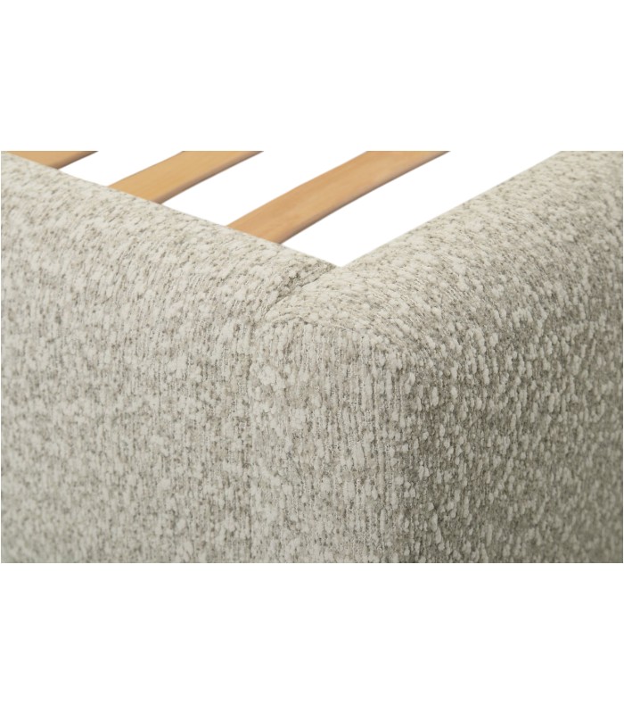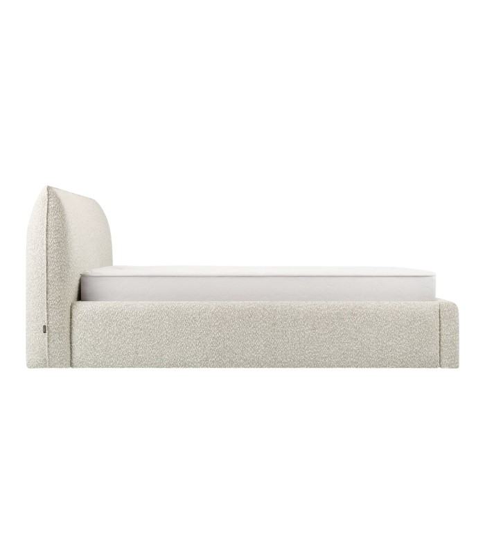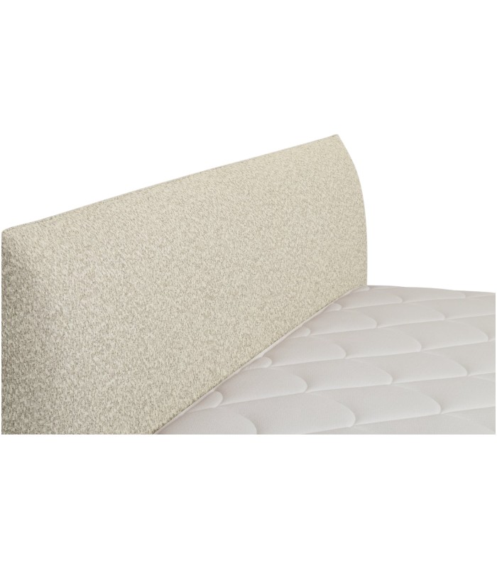 Phần đầu giường bo cong nhẹ là điểm nhấn nổi bật, tạo nên dáng vẻ mềm mại và là điểm tựa lý tưởng để đọc sách, thư giãn hay xem phim. Chất liệu vải lông cừu kết hợp cùng tông be dịu nhẹ góp phần mang đến bầu không khí ấm áp và thanh thoát cho phòng ngủ