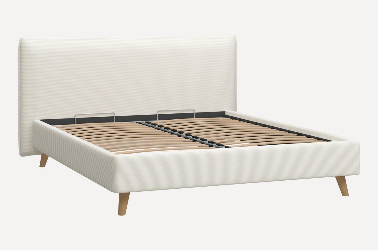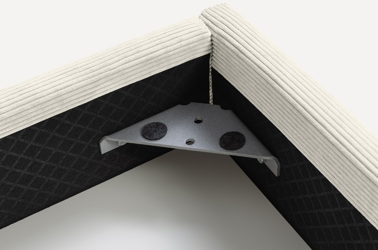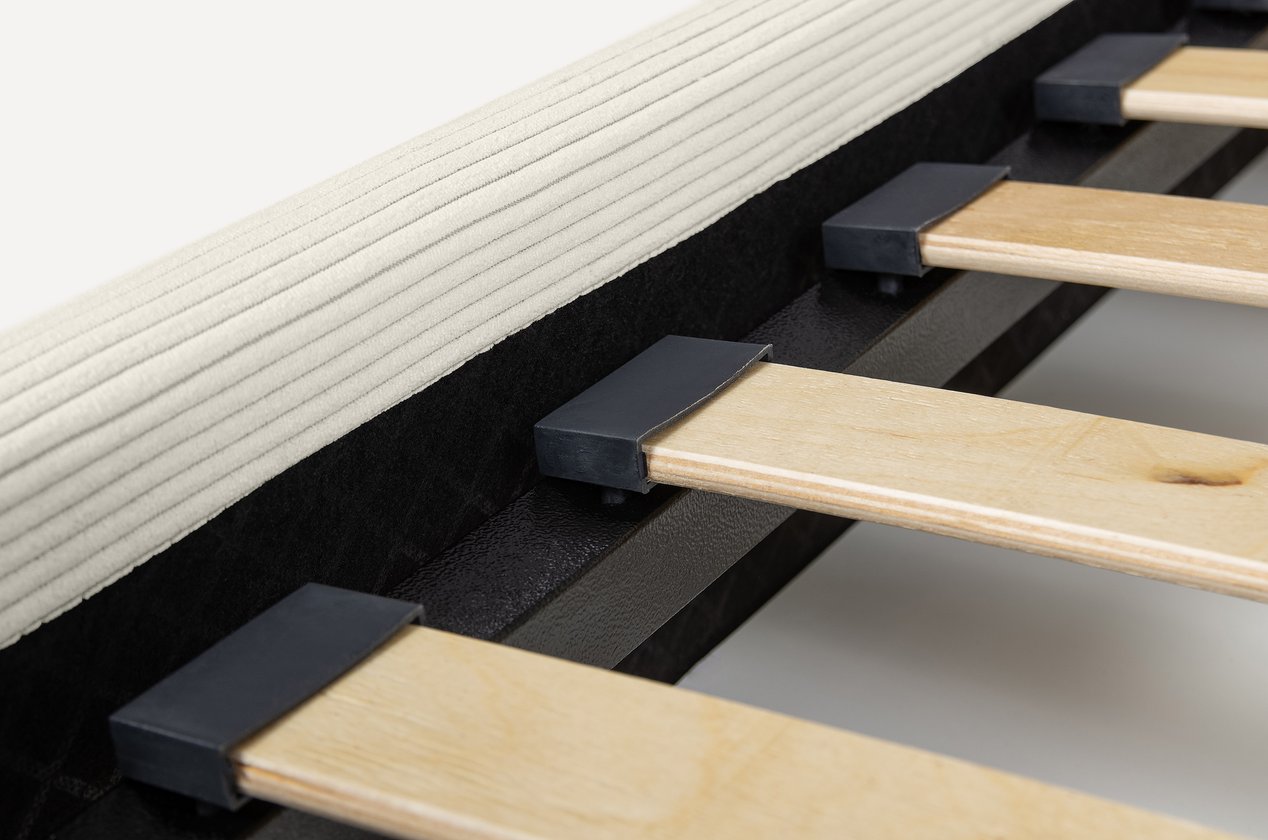 Phần thân giường được cấu thành từ MDF 17mm kết hợp ván sợi, ván ép và ván dăm, mang lại độ ổn định cao và hạn chế biến dạng trong quá trình sử dụng lâu dài. Chân giường sử dụng gỗ nguyên khối ghép ngón – công nghệ ghép nhiều thanh gỗ nhỏ nhằm tăng độ bền, khả năng chịu thay đổi nhiệt độ và độ ẩm tốt hơn gỗ nguyên tấm truyền thống, đồng thời giảm thiểu lãng phí tài nguyên.