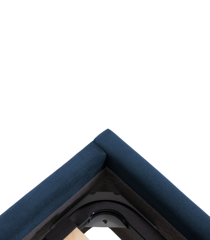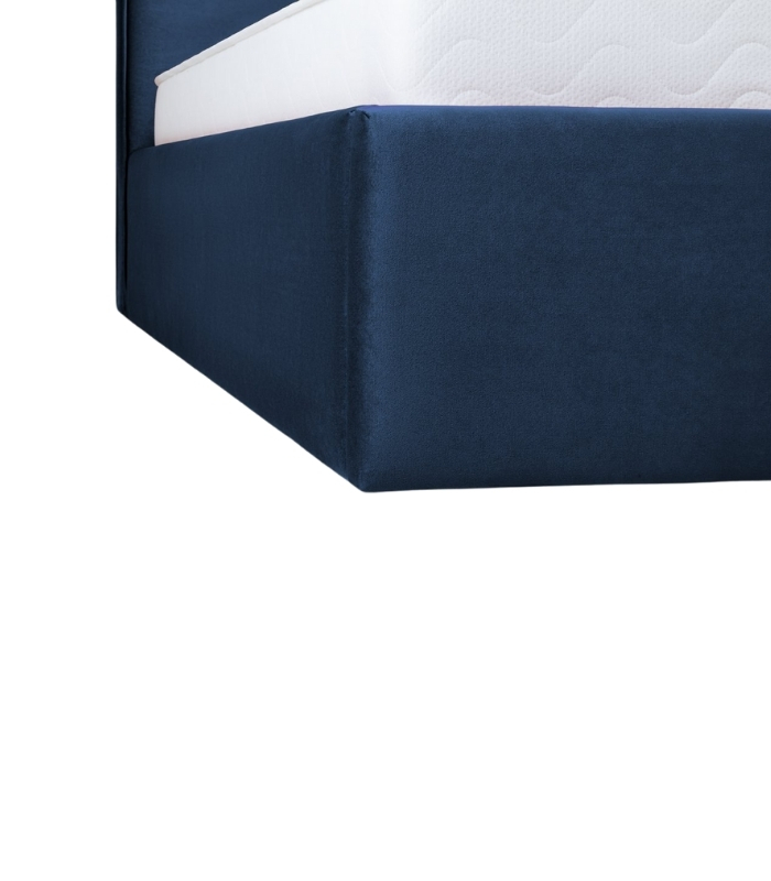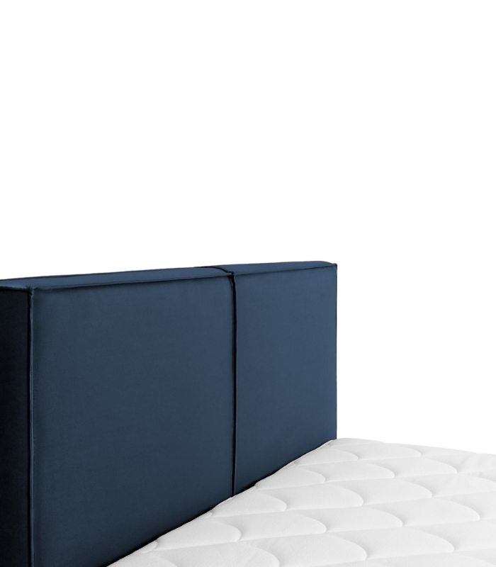 Bề mặt nhung cao cấp có độ mịn đặc trưng, ánh sắc xanh đậm thay đổi nhẹ theo ánh sáng, tạo nên hiệu ứng sang trọng và đẳng cấp. Thiết kế vuông gọn, cân đối giữa phần đầu và thân giường mang lại tổng thể hài hòa, vững vàng.