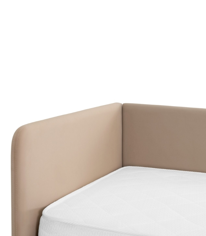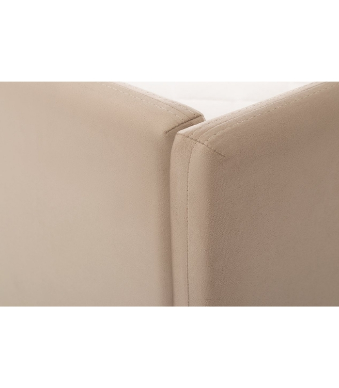 Thiết kế đầu giường bo cong tôn lên sự mềm mại, kết hợp cùng lớp nhung nâu mịn tạo cảm giác dễ chịu khi chạm vào. Hệ khung chắc chắn, chân cao thanh thoát, giữ cho tổng thể giường vừa vững vừa nhẹ trong bố cục không gian.