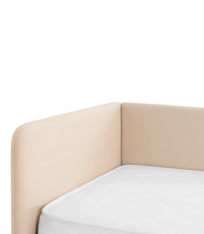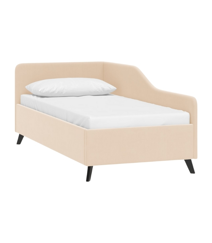 Phần nhung be mềm mịn kết hợp cùng đầu giường cong nhẹ tạo cảm giác thư giãn khi sử dụng. Dù kích thước 120 lớn hơn, tổng thể vẫn trông thanh thoát nhờ chân giường cao và thiết kế tinh giản.