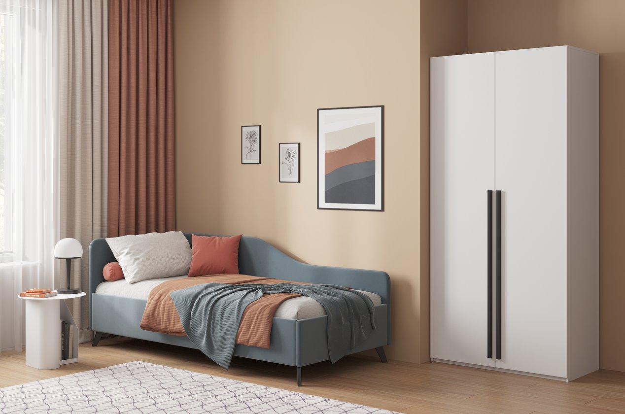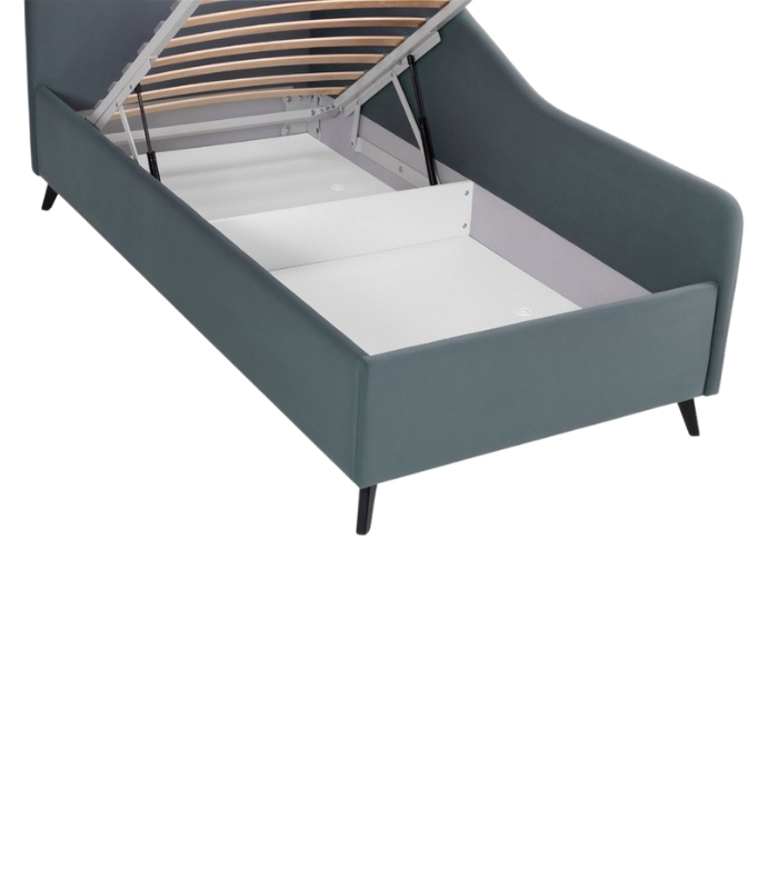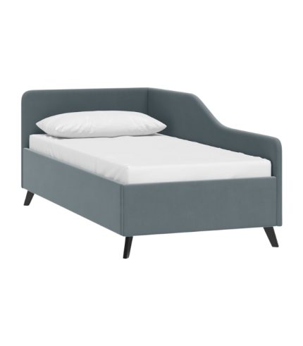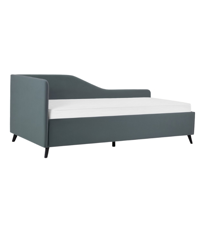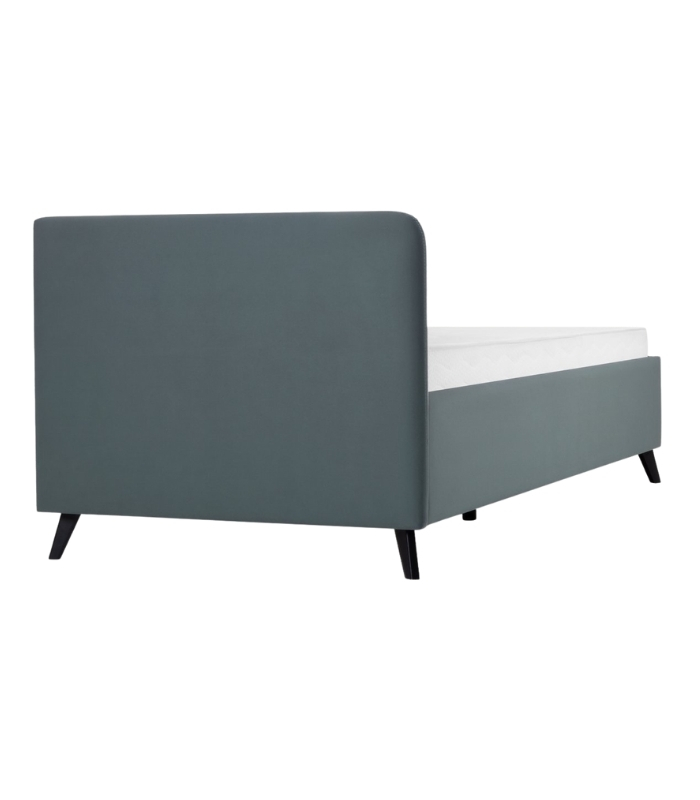 Thiết kế giường với đường cong mềm ở đầu giường và chân cao tạo cảm giác thanh thoát dù kích thước nhỏ gọn. Lớp nhung xám Grafit mang đến sự êm ái khi chạm vào, đồng thời hạn chế bám bụi, thích hợp với người bận rộn.