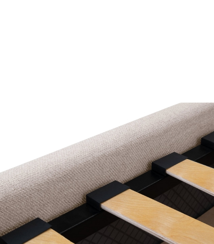Chất liệu vải Soft Pearl được lựa chọn kỹ lưỡng, có bề mặt mịn, cầm chắc tay, sắc màu bền theo thời gian. Khung giường chắc chắn đi kèm hệ nan chịu lực bền bỉ giúp nâng đỡ tốt nệm và trọng lượng cơ thể. Toàn bộ phần bo cong được thợ xưởng xử lý thủ công tỉ mỉ, giúp các nếp vải ôm sát, không nhăn, tạo cảm giác hoàn thiện cao cấp.