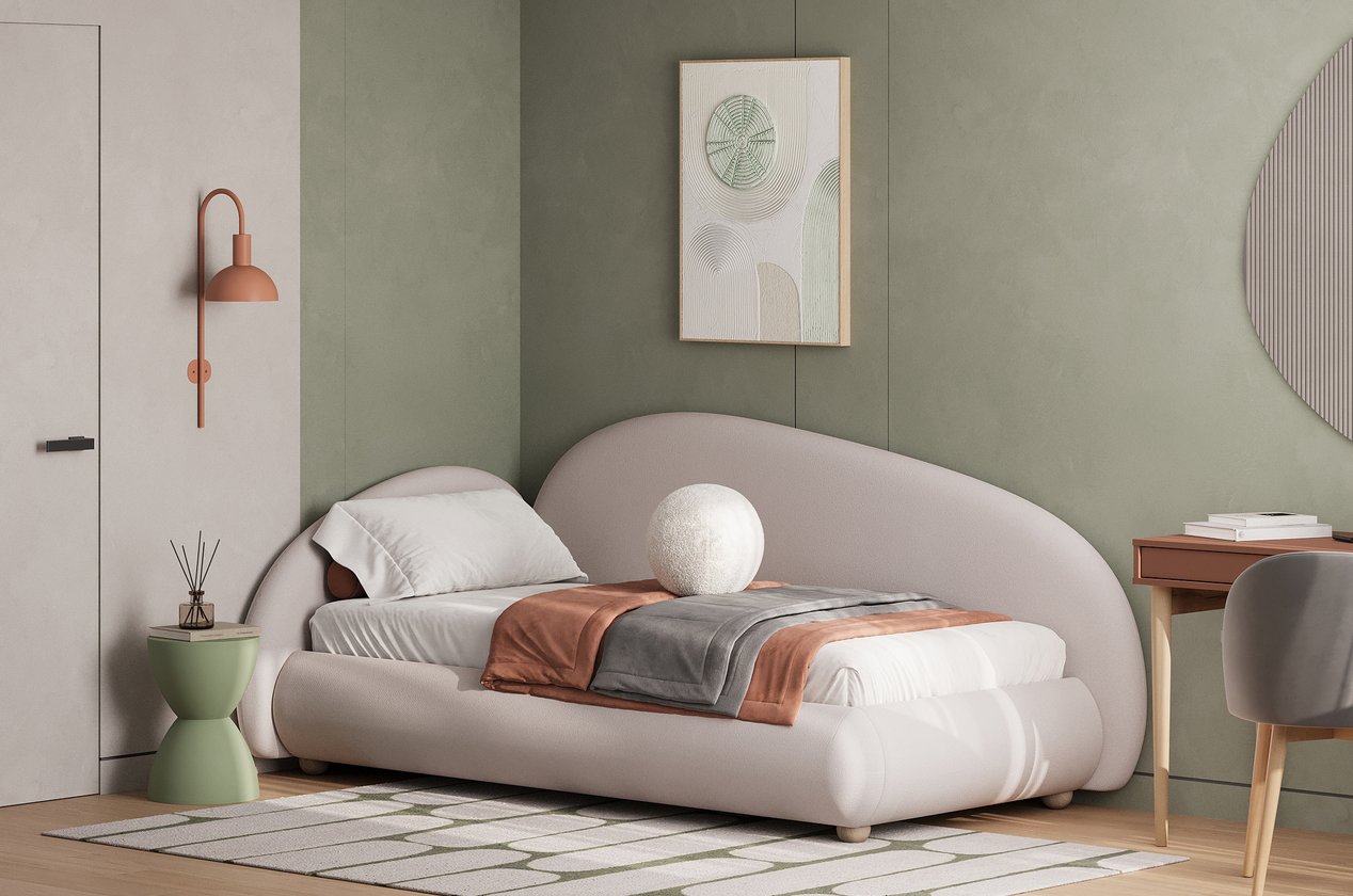 Đầu giường và cạnh giường được tạo hình theo đường cong ôm trọn, đem lại cảm giác nhẹ nhàng khi nhìn và thoải mái khi tựa lưng đọc sách. Màu Pearl giúp tôn lên độ phồng của phần tựa, tạo cảm giác mềm mịn như một chiếc gối lớn bao bọc người dùng. Đây là lựa chọn lý tưởng cho phòng ngủ nữ tính, phòng bé gái hoặc không gian đề cao sự tinh tế.