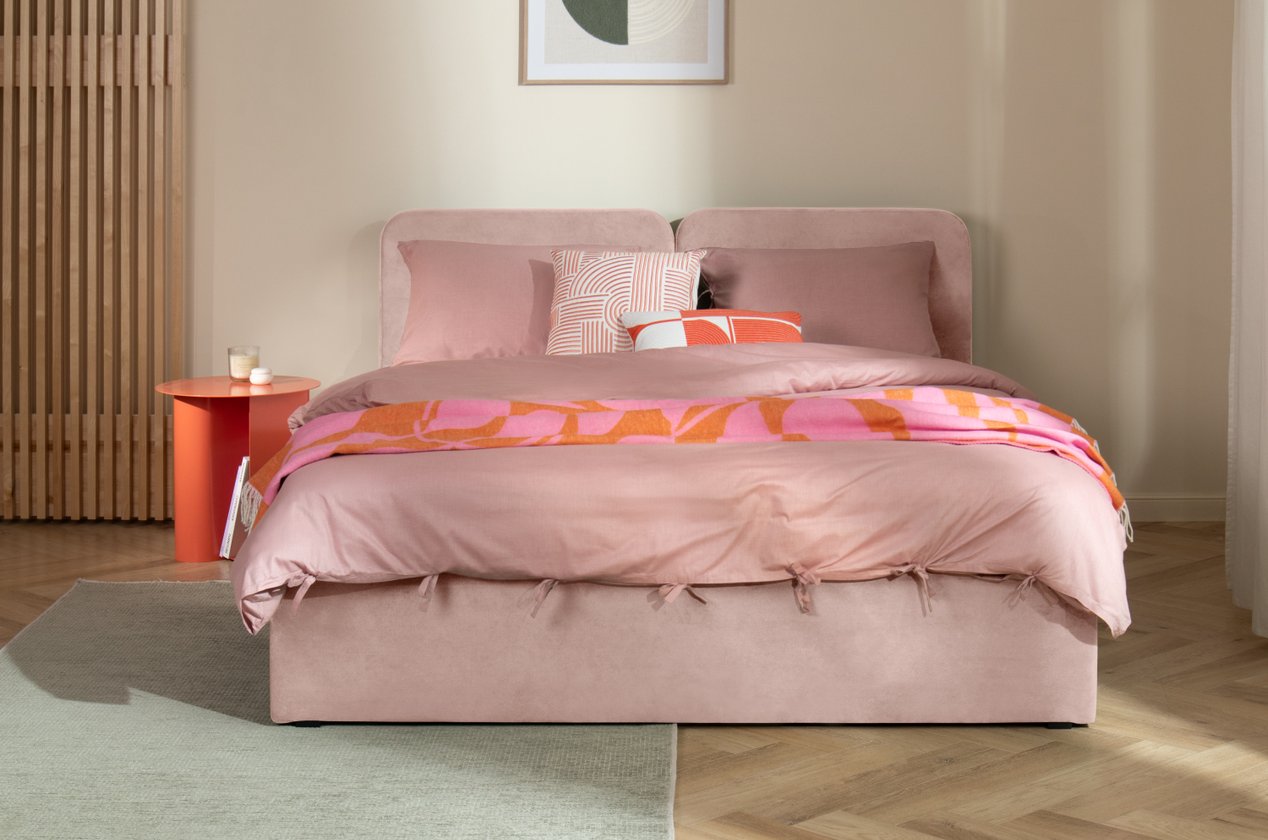 Nhìn tổng thể, chiếc giường mang nét thanh thoát nhưng vẫn giữ được sự chắc chắn cần có. Nhung Danel phiên bản Pink cho độ mịn cao, bề mặt mềm và có độ phản sáng nhẹ tạo hiệu ứng rất đẹp mắt. Chất liệu này cũng có khả năng giữ màu ổn, đảm bảo sản phẩm luôn tươi tắn theo thời gian.