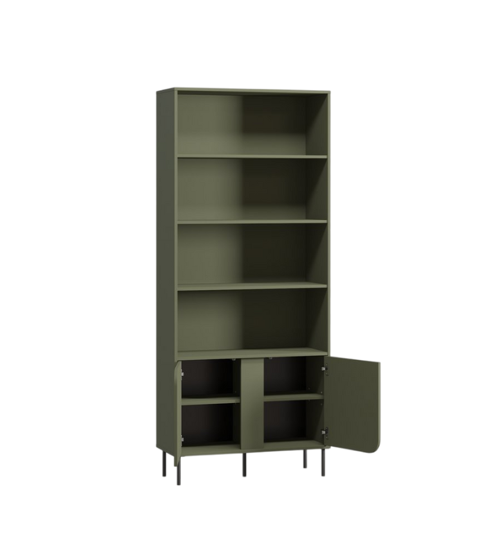 Kệ gồm nhiều tầng trưng bày mở, thuận tiện để sắp xếp sách, đồ trang trí, khung ảnh hoặc các vật dụng cá nhân, giúp không gian luôn gọn gàng và khoa học. Phần dưới là hai cánh tủ đóng, mang lại sự riêng tư cho những vật dụng cần giấu, đồng thời tạo điểm nhấn tinh tế nhờ cánh sơn PU một mặt.