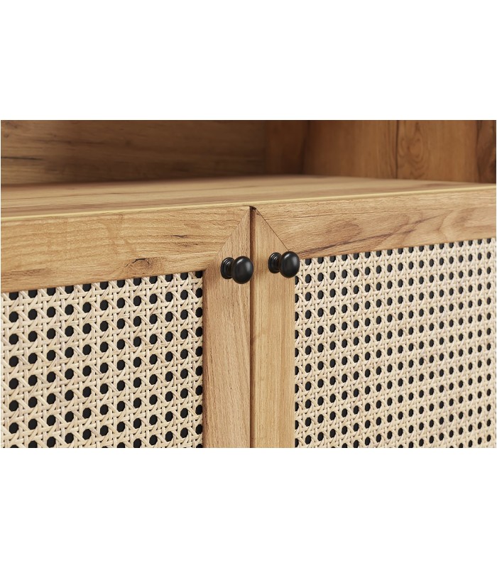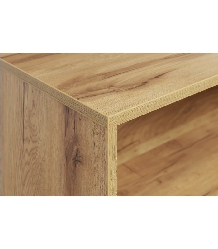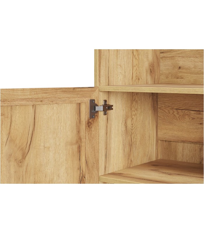 Thiết kế thông minh với 3 ngăn mở rộng lớn giúp trưng bày sách, decor hoặc đồ lưu niệm; trong khi 2 cánh tủ bên dưới mở ra 2 ngăn chứa lớn tiện dụng, đáp ứng nhu cầu lưu trữ đa dạng mà vẫn giữ tổng thể gọn gàng. Chân gỗ tự nhiên được xử lý kỹ lưỡng, chắc chắn và góp phần hoàn thiện vẻ thanh thoát cho sản phẩm.