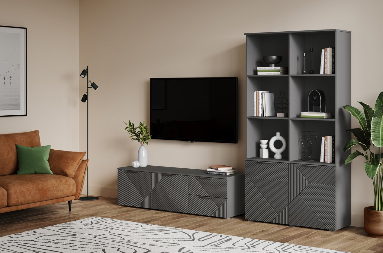 Kệ Trang Trí Shelton Xám Chì – 2 sở hữu vẻ đẹp hiện đại, trầm ổn và đầy chiều sâu. Sản phẩm làm từ MDF phủ Melamine chống ẩm, phù hợp khí hậu và sử dụng lâu dài. Cánh sơn PU 1 mặt giúp màu xám chì sắc nét, mịn và sang trọng.