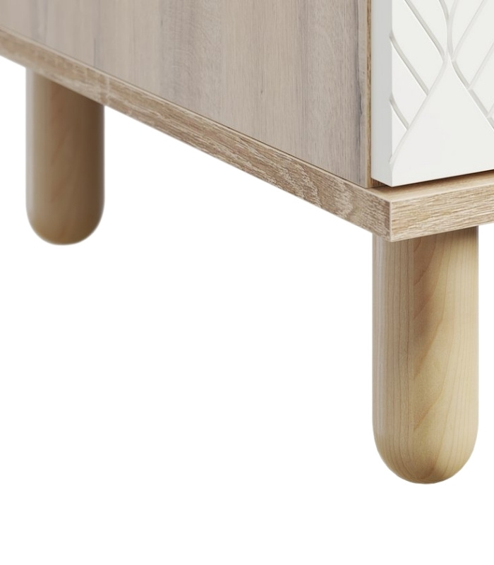 Bố cục các ngăn cho phép người dùng vừa trưng bày đồ decor, vừa lưu trữ vật dụng cần thiết một cách gọn gàng. Thiết kế chân gỗ thanh mảnh không chỉ tăng độ bền mà còn mang lại cảm giác nhẹ nhàng, tinh tế cho tổng thể.