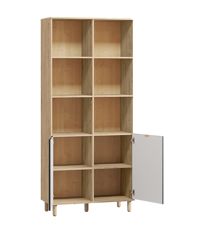 Bố cục kệ gồm bốn ô trưng bày phía trên – nơi lý tưởng để sắp xếp sách, lọ hoa hoặc phụ kiện trang trí – và hai ngăn tủ bên dưới giúp giấu gọn đồ dùng cá nhân. Thiết kế chân gỗ thanh mảnh nhưng chắc chắn, nâng khối tủ tạo cảm giác nhẹ nhàng, tinh tế.
