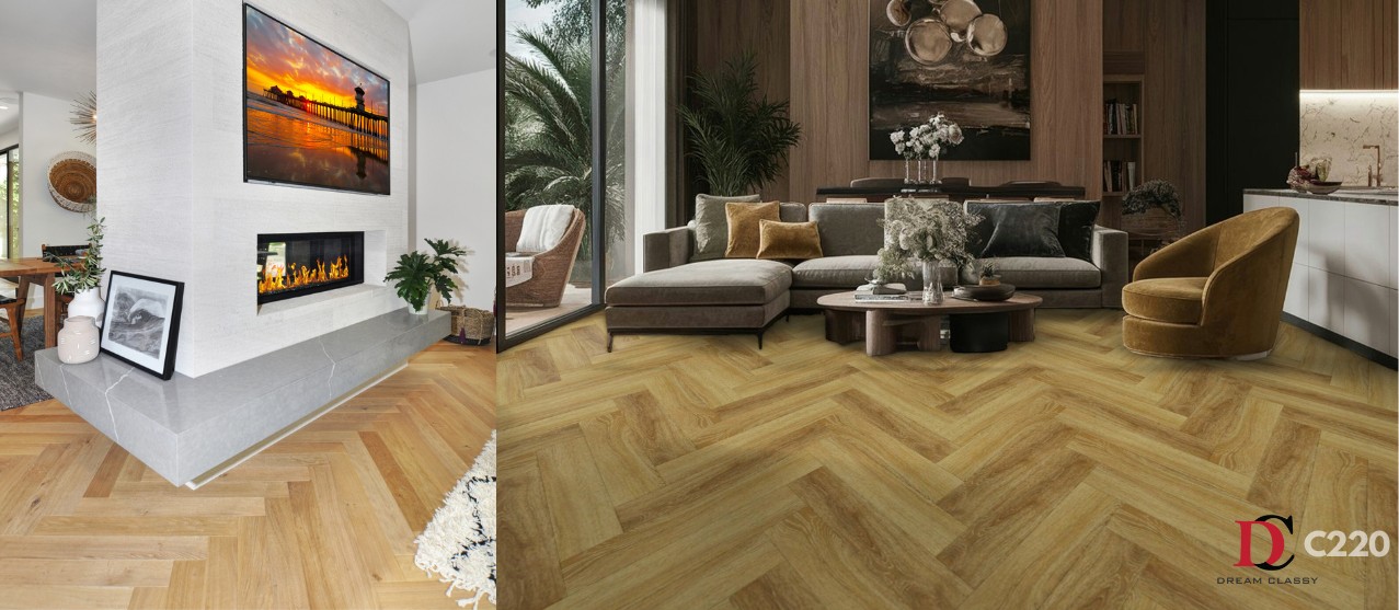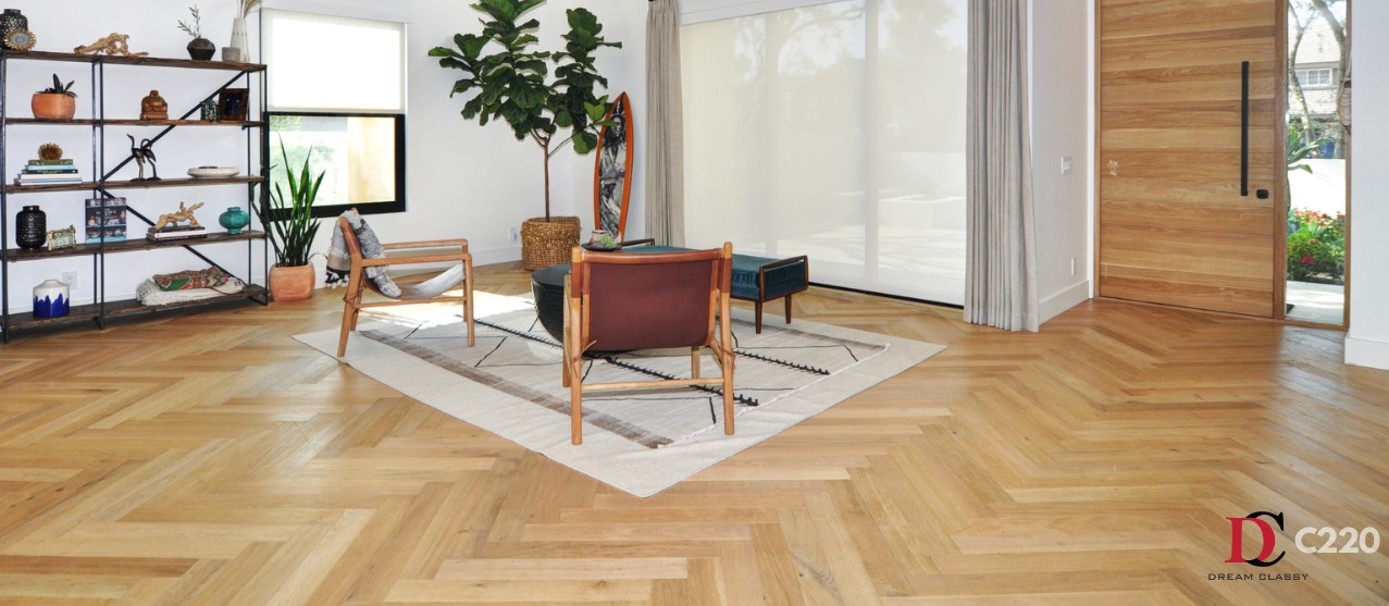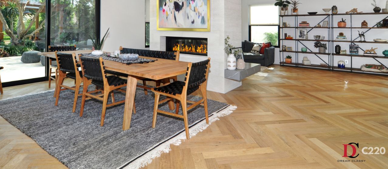 Sàn gỗ Xương cá Dream Classy C220 mang đến cảm giác ấm áp, gần gũi và vô cùng sung túc cho không gian sống. Kích thước thanh gỗ 60,4 x 9,4 x 0,8 cm khi được lát chéo góc tạo nên hiệu ứng chiều sâu hun hút, giúp diện mạo ngôi nhà trở nên bề thế và quy mô hơn. Đây là phong cách rất được ưa chuộng bởi nó mang lại sự sang trọng đặc trưng nhưng vẫn giữ được nét mộc mạc và thân thiện cho gia đình.