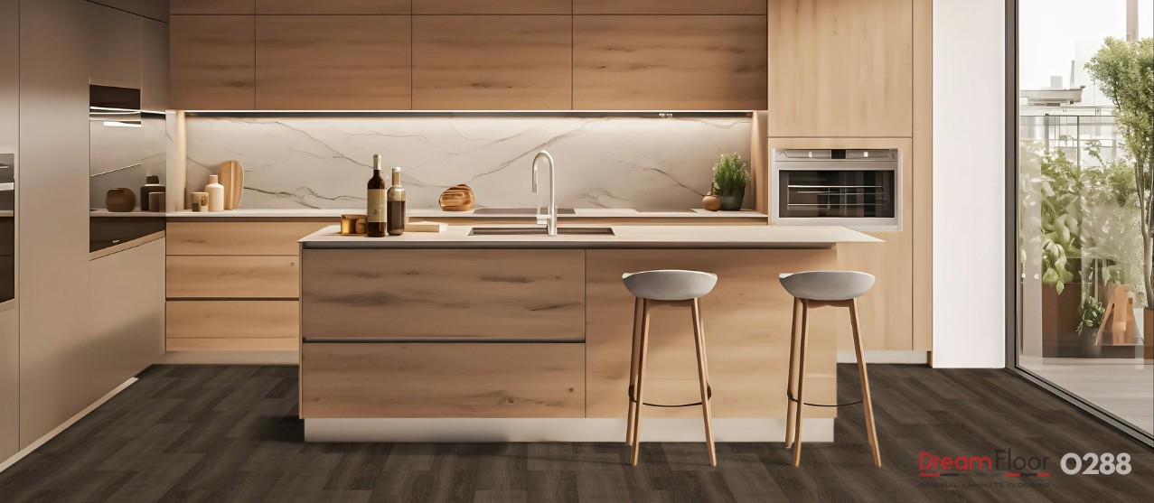 Đặc tính trầm của sàn O288 giúp che giấu bụi bẩn cực kỳ tốt, giữ cho không gian luôn có cảm giác sạch sẽ và vô cùng gọn gàng hàng ngày. Bề mặt sàn cứng cáp chống mài mòn vượt trội, bảo vệ mặt nền khỏi các tác động vật lý trong sinh hoạt. Sự tương phản giữa mặt sàn và nội thất sáng màu sẽ tạo nên hiệu ứng thị giác vô cùng hiện đại, nghệ thuật và đầy cuốn hút cho gia chủ.