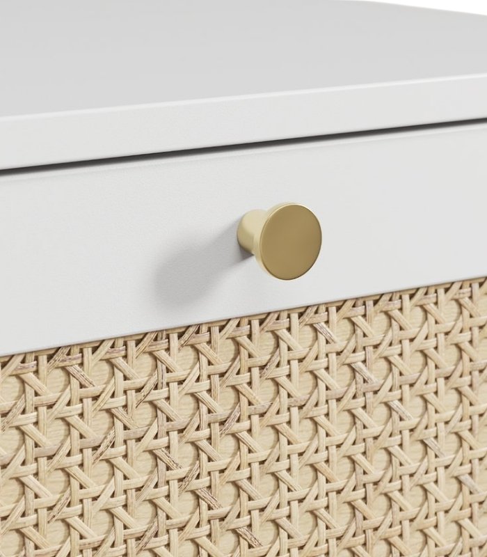 Thiết kế một ngăn kéo tiện dụng với cánh phủ mây sơn một mặt là đặc trưng của bộ sưu tập Alvis, mang lại cảm giác gần gũi và tự nhiên giữa tổng thể trắng tinh khiết. Tay nắm nhỏ gọn màu vàng ánh nhẹ là điểm chấm tinh tế, tạo thêm nét sang trọng mà vẫn giữ được sự tối giản, thanh thoát.