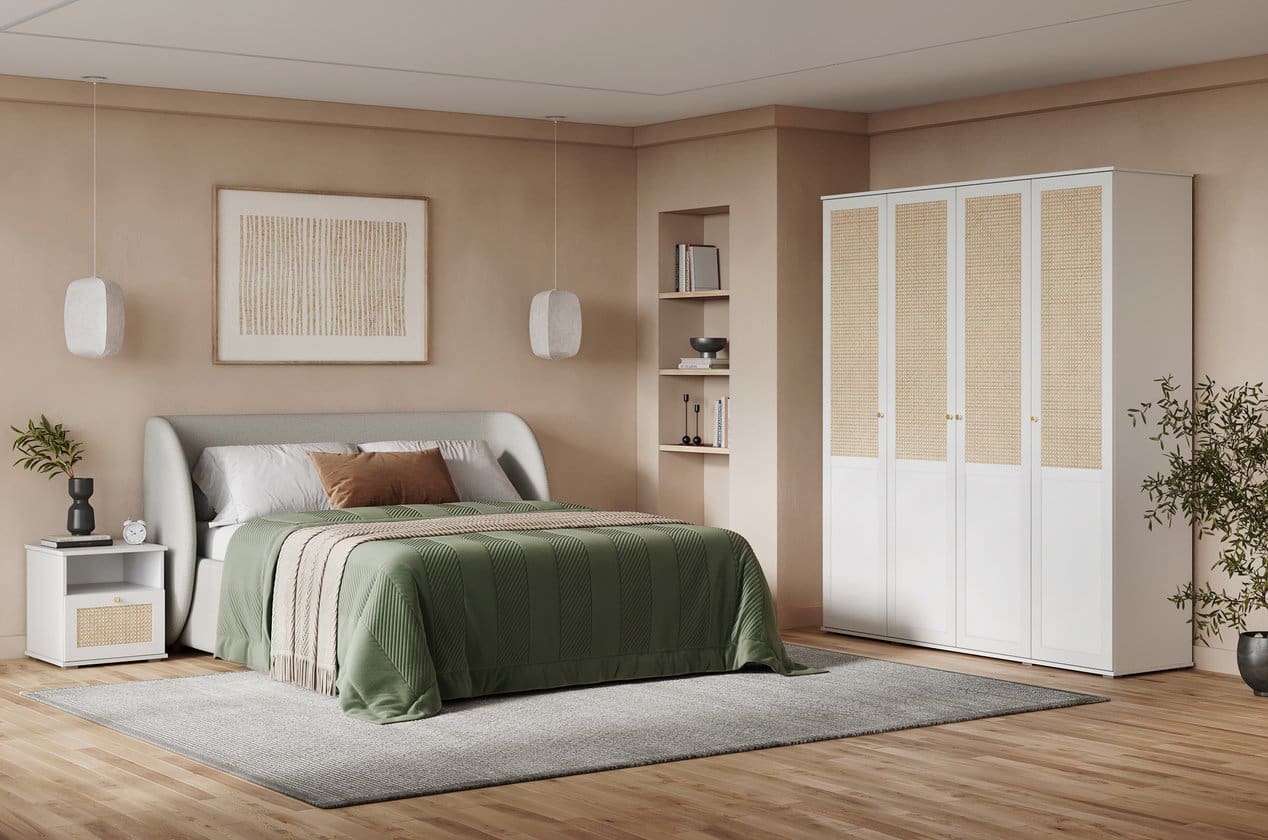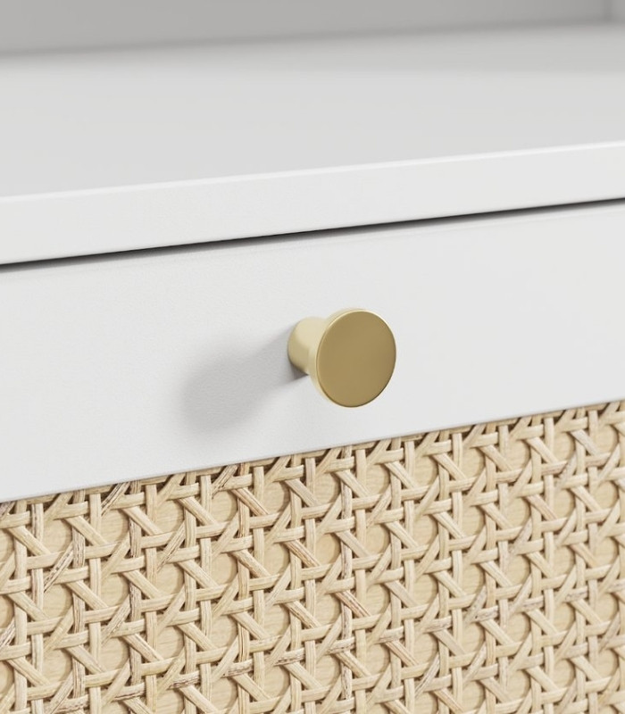 Thiết kế gồm một ngăn mở phía trên giúp dễ dàng đặt sách, đồng hồ hoặc những vật dụng thường dùng hằng ngày, cùng một ngăn kéo phía dưới với tay nắm nhỏ xinh, tiện cho việc cất gọn đồ cá nhân. Sự kết hợp giữa tông trắng tinh tế và chi tiết mây tự nhiên giúp chiếc tủ dễ dàng hòa hợp với nhiều phong cách nội thất — từ Scandinavian, Japandi cho đến hiện đại tối giản.