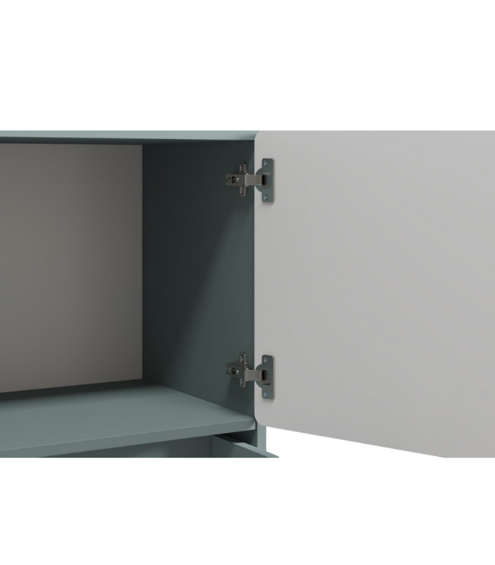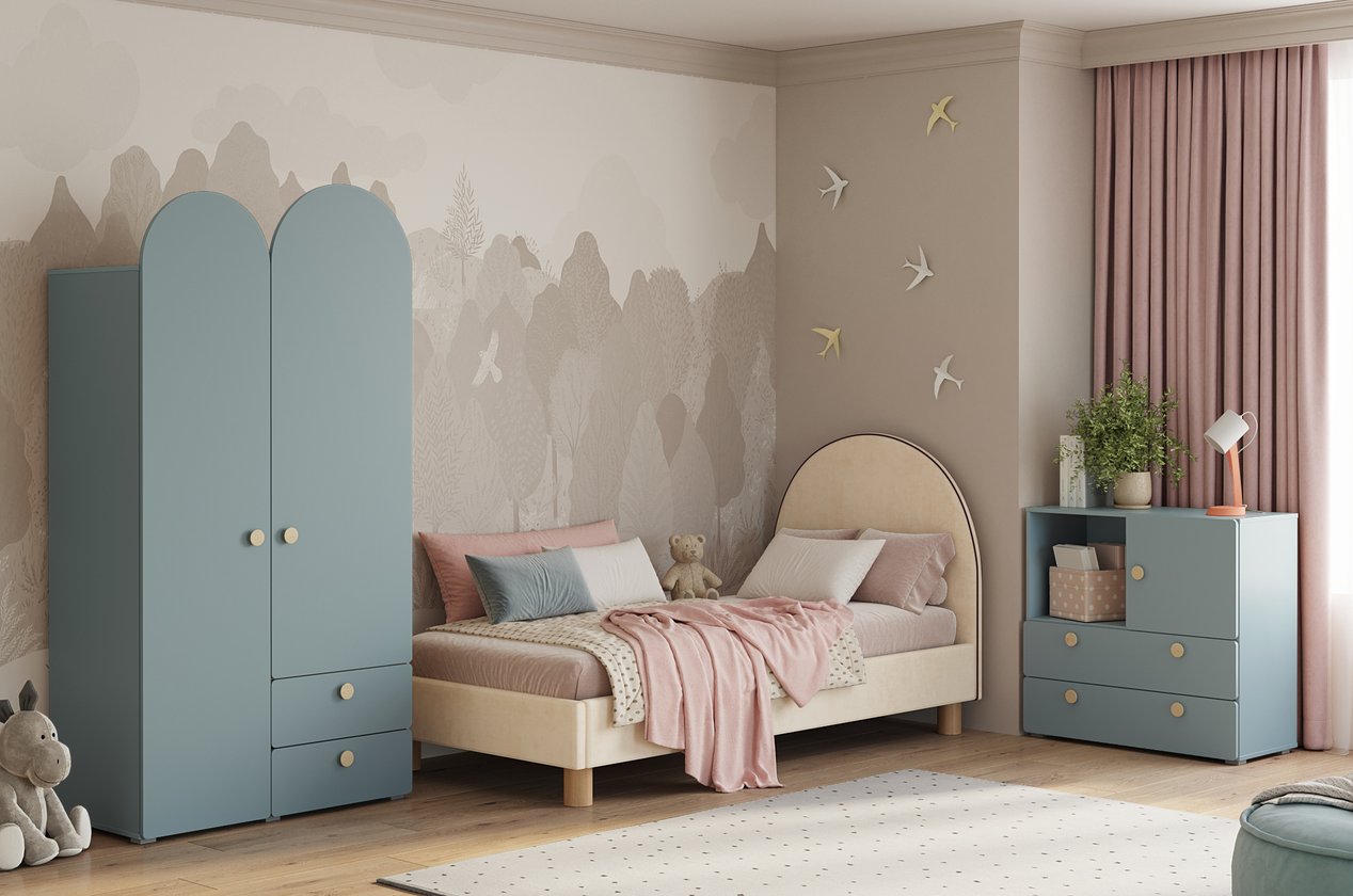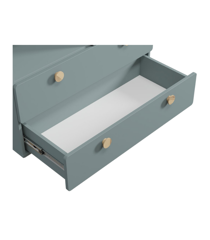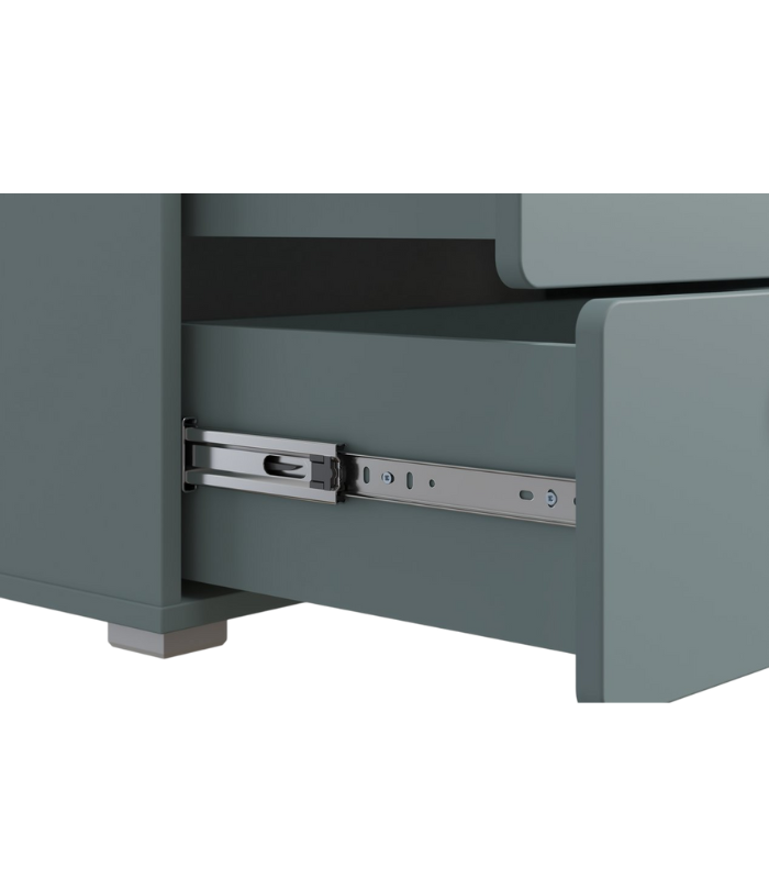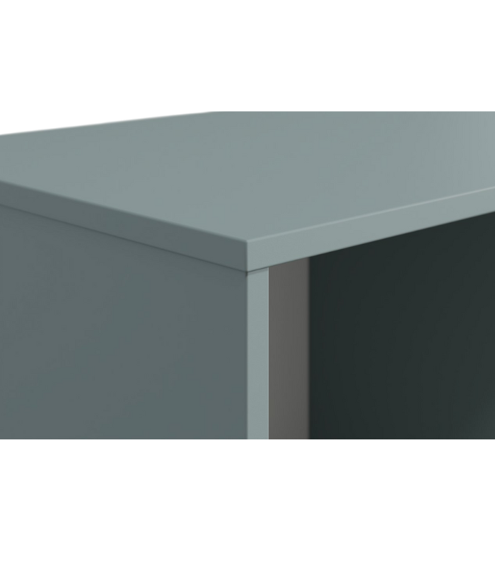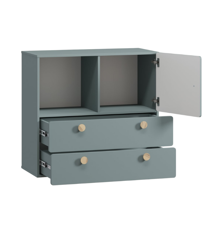 Tông xanh dương nhạt nhẹ nhàng gợi cảm giác yên bình, rất phù hợp với không gian nghỉ ngơi hoặc phòng ngủ trẻ em. Thiết kế gồm 2 ngăn kéo lớn, 1 ngăn tủ và 1 hộc mở, giúp sắp xếp đồ dùng gọn gàng, tiện lợi.