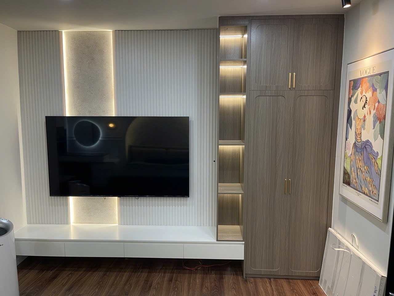 Tủ cà phê sữa đẹp, để đèn ngủ lên nhìn sang hẳn. Nhân viên hỗ trợ từ lúc chọn màu đến lắp đặt