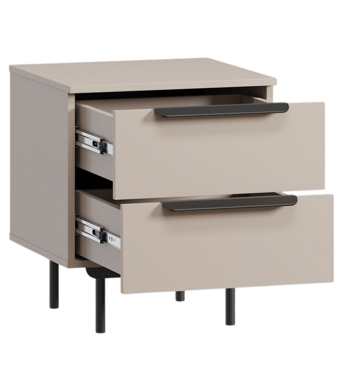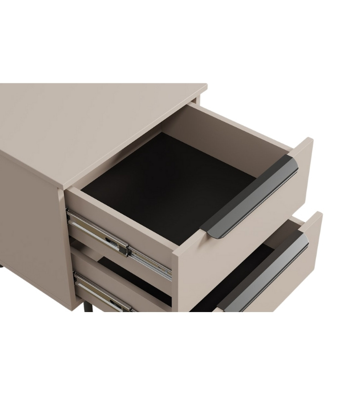Thiết kế hai ngăn kéo song song với tay nắm ngang mang đến cảm giác gọn gàng, liền mạch, đồng thời giúp việc cất giữ đồ dùng cá nhân như sách, kính, sạc điện thoại trở nên tiện lợi hơn. Từng chi tiết của tủ được hoàn thiện tỉ mỉ, đảm bảo độ khít và sự mượt mà khi đóng mở.