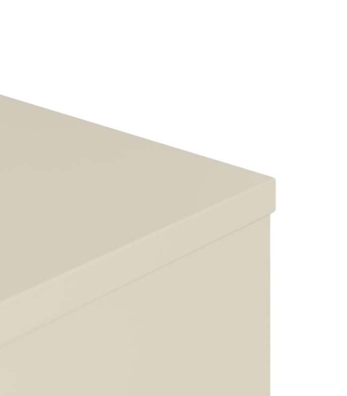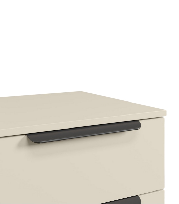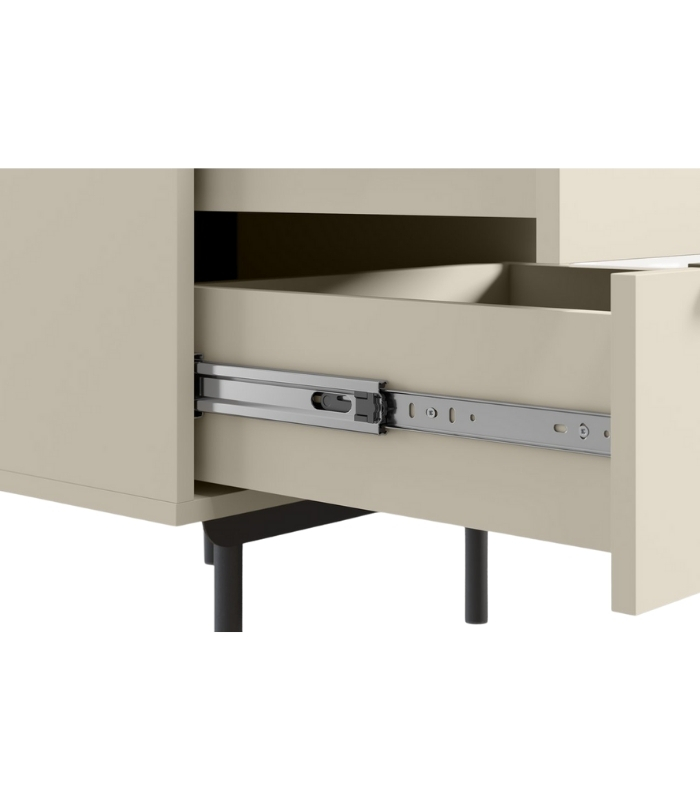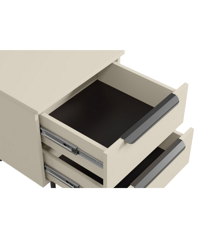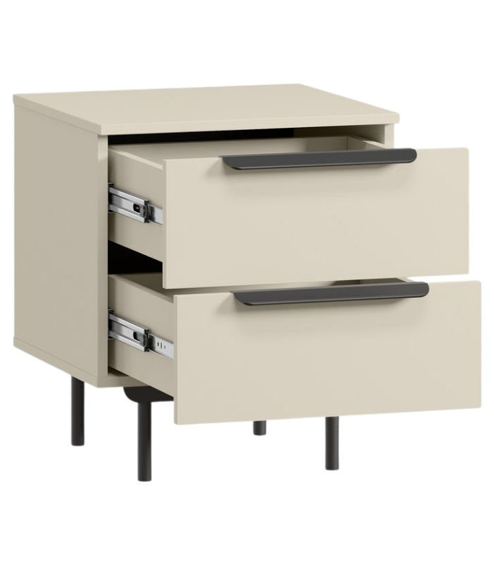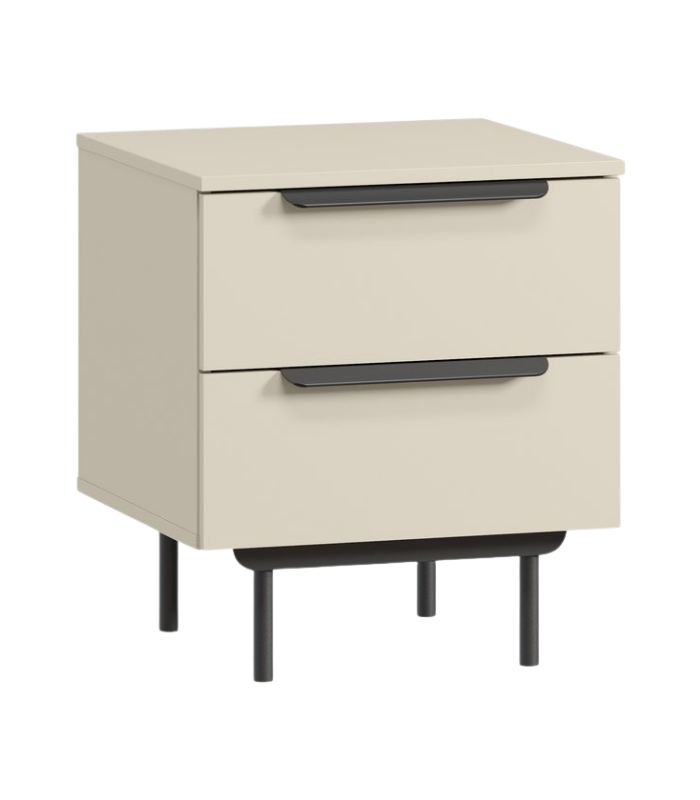 Tủ được thiết kế tối giản với hai ngăn kéo liền mạch, tạo cảm giác hài hòa và gọn gàng. Tay nắm và chân tủ kim loại đen nhám nổi bật trên nền trắng kem, tạo điểm nhấn tinh tế và hiện đại. Đây là mẫu tủ lý tưởng để đặt cạnh giường ngủ, sofa hay góc đọc sách.