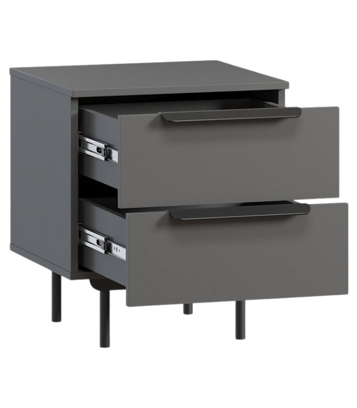 Thiết kế hai ngăn kéo được bố trí hợp lý, giúp lưu trữ tiện lợi các vật dụng nhỏ như sách, phụ kiện hoặc đồ dùng cá nhân. Tay nắm và chân tủ đen mờ tạo sự đồng nhất và điểm nhấn sắc nét cho tổng thể.