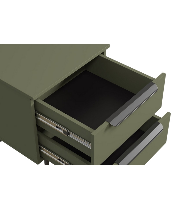 Kiểu dáng nhỏ gọn cùng hai ngăn kéo thiết kế liền mạch giúp sắp xếp vật dụng gọn gàng mà không chiếm diện tích. Chi tiết tay nắm và chân đen mờ làm nổi bật tông xanh dịu, tạo nên sự cân đối giữa hiện đại và mềm mại.