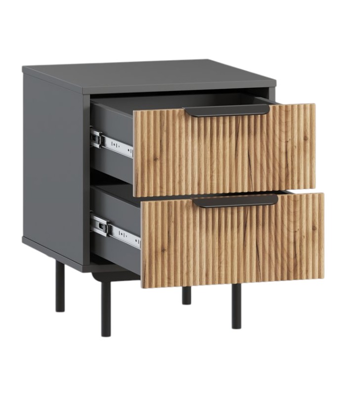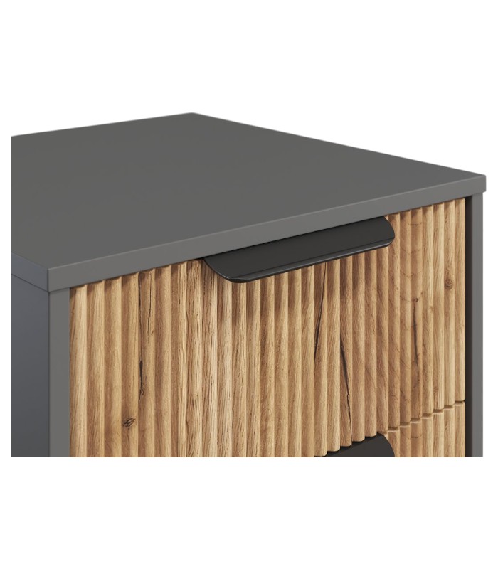 Tủ Đầu Giường Levante Màu Xám Chì – 1 mang đến vẻ đẹp hiện đại, sang trọng nhưng vẫn ấm áp cho phòng ngủ. Sắc xám chì chủ đạo kết hợp cùng cánh lam vân gỗ tinh tế tạo cảm giác yên tĩnh, thanh lịch và dễ phối với nhiều phong cách nội thất, từ hiện đại đến tối giản.
