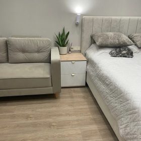 Tủ thiết kế đơn giản nhưng đặt cạnh giường nhìn rất hài hòa. Thời gian thi công nhanh hơn dự kiến