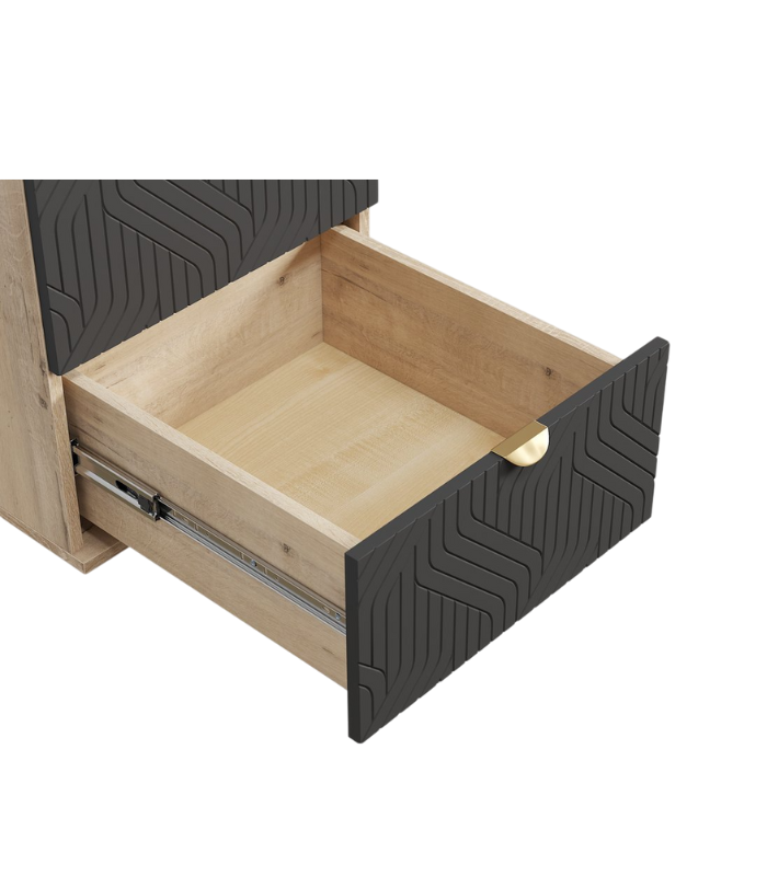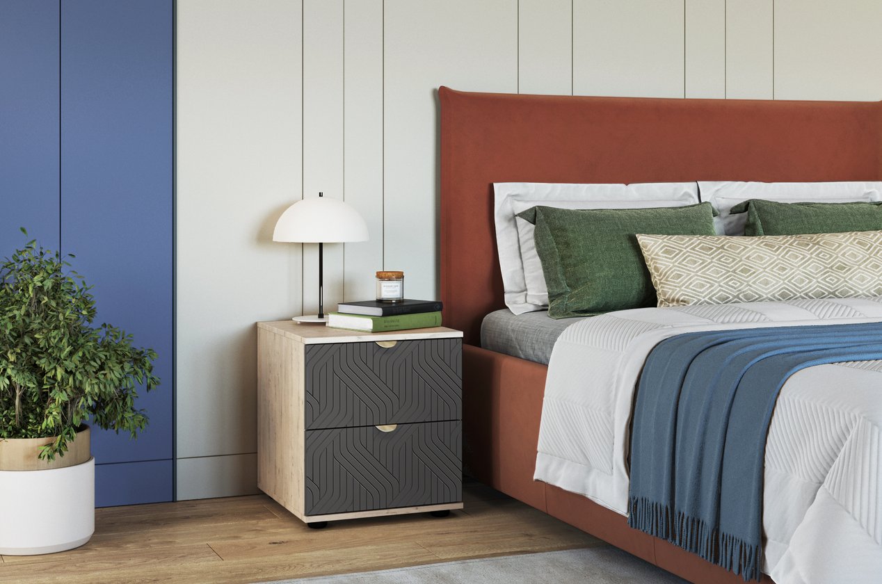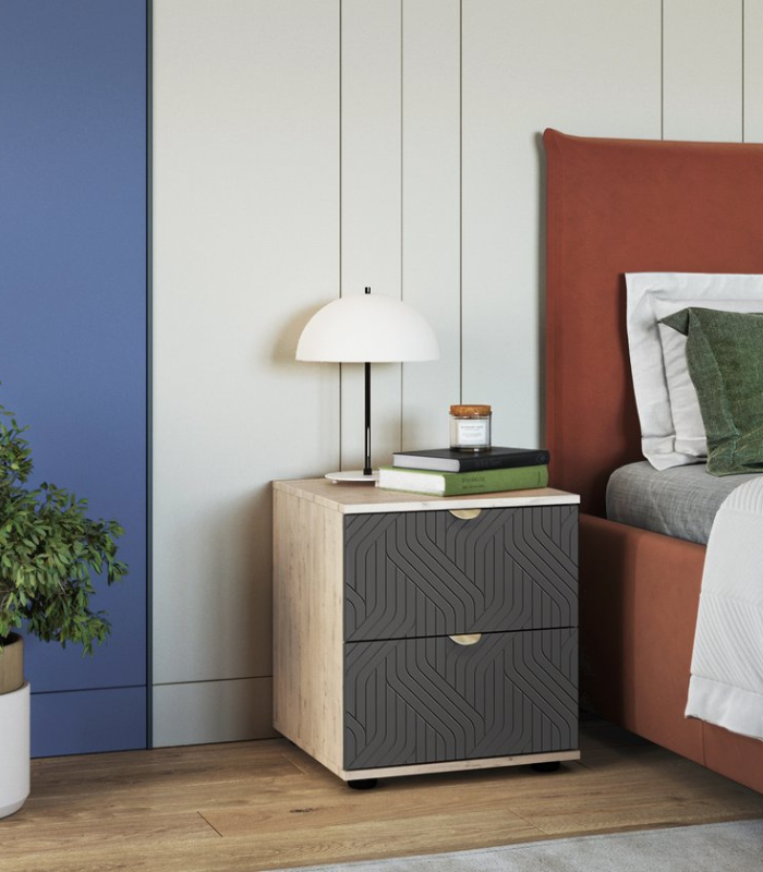 Kích thước 47x50x53 cm phù hợp với nhiều không gian, vừa tiện dụng vừa gọn gàng. Thiết kế 2 ngăn kéo rộng rãi, giúp lưu trữ đồ dùng cá nhân như sách, điện thoại, vật dụng nhỏ gọn ngăn nắp. Mặt trên tủ trang trí các vân tinh tế, tạo điểm nhấn hiện đại và sang trọng cho phòng ngủ. Màu Xám Chì trung tính, dễ phối hợp với các tông màu nội thất khác, mang đến không gian tinh tế.