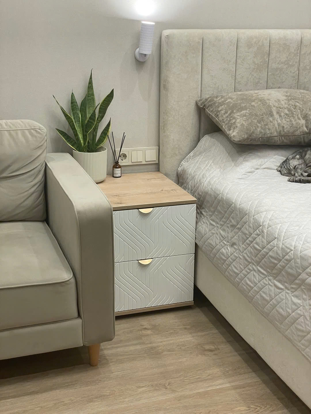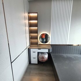 Tủ thiết kế đơn giản nhưng đặt cạnh giường nhìn rất cuốn mắt. Thời gian thi công nhanh hơn dự kiến.