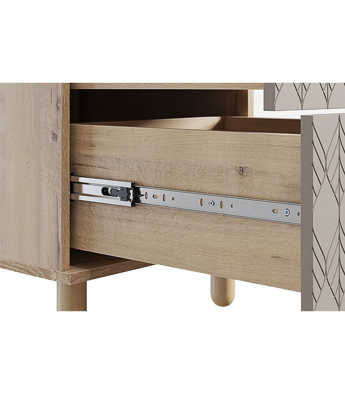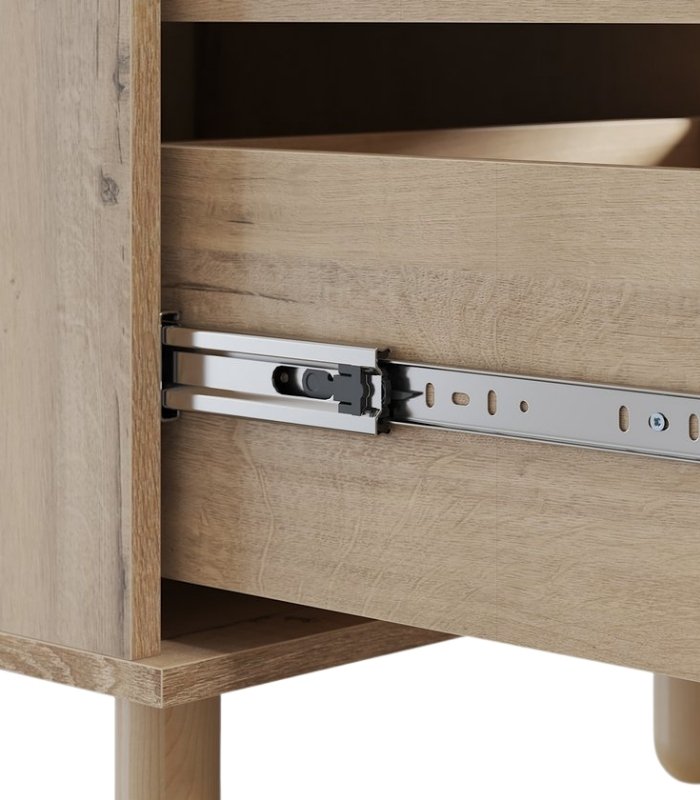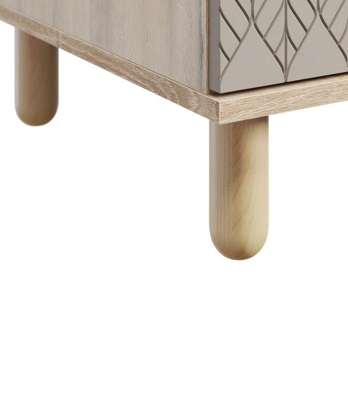 Phần thân được chế tạo từ ván MDF chống ẩm dày 17mm, phủ melamine vân gỗ sáng nhằm đảm bảo độ ổn định, hạn chế cong vênh hay biến dạng trong điều kiện khí hậu nóng ẩm. Cánh sơn hoàn thiện kỹ, bề mặt láng mịn và bền màu, cho phép lau chùi dễ dàng mà không lo bong tróc. Chân gỗ tròn chắc chắn tạo thế vững vàng, đồng thời giúp sản phẩm trông nhẹ nhàng và thanh thoát hơn.