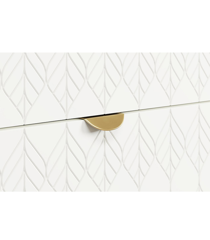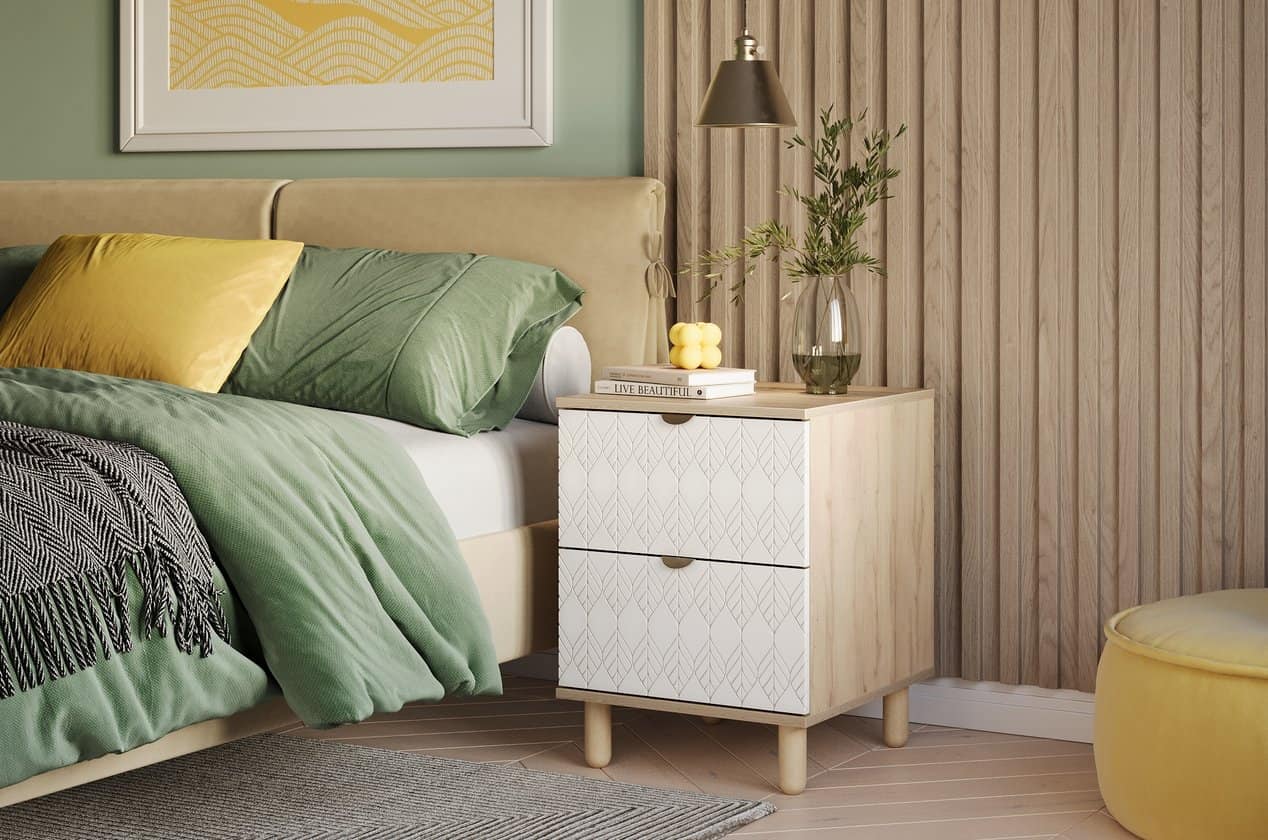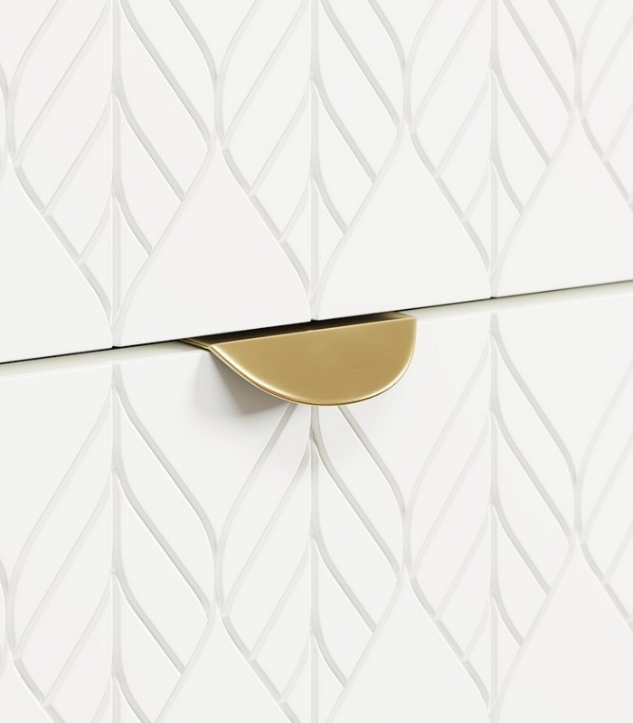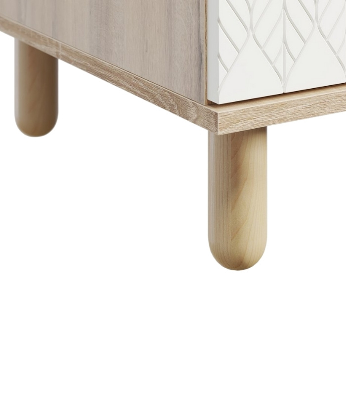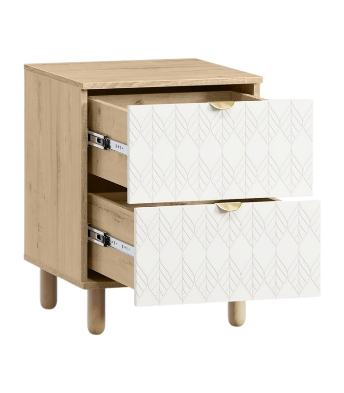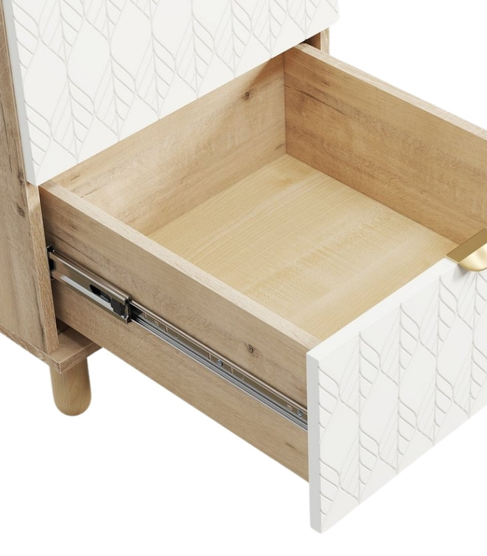 Tủ Đầu Giường Tedjons Trắng – 1 mang vẻ đẹp tinh giản và thanh lịch, dễ dàng hòa hợp với mọi không gian phòng ngủ hiện đại. Thiết kế gồm hai hộc kéo gọn gàng và phần chân gỗ tròn thanh thoát, giúp tủ có dáng đứng vững vàng mà không tạo cảm giác nặng nề. Cánh sơn trắng họa tiết lá nổi tinh tế mang lại điểm nhấn nhẹ nhàng, khiến tổng thể thêm phần thanh thoát và sang trọng.