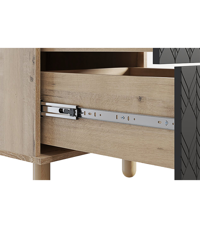Bên trong tủ là hai ngăn kéo có ray trượt êm ái, vận hành mượt mà nhờ phụ kiện đạt chuẩn thương hiệu uy tín. Sản phẩm được sản xuất trực tiếp tại xưởng TinHome, nơi quy trình kiểm định chất lượng được thực hiện nghiêm ngặt để đảm bảo độ chính xác và độ bền cho từng chi tiết.